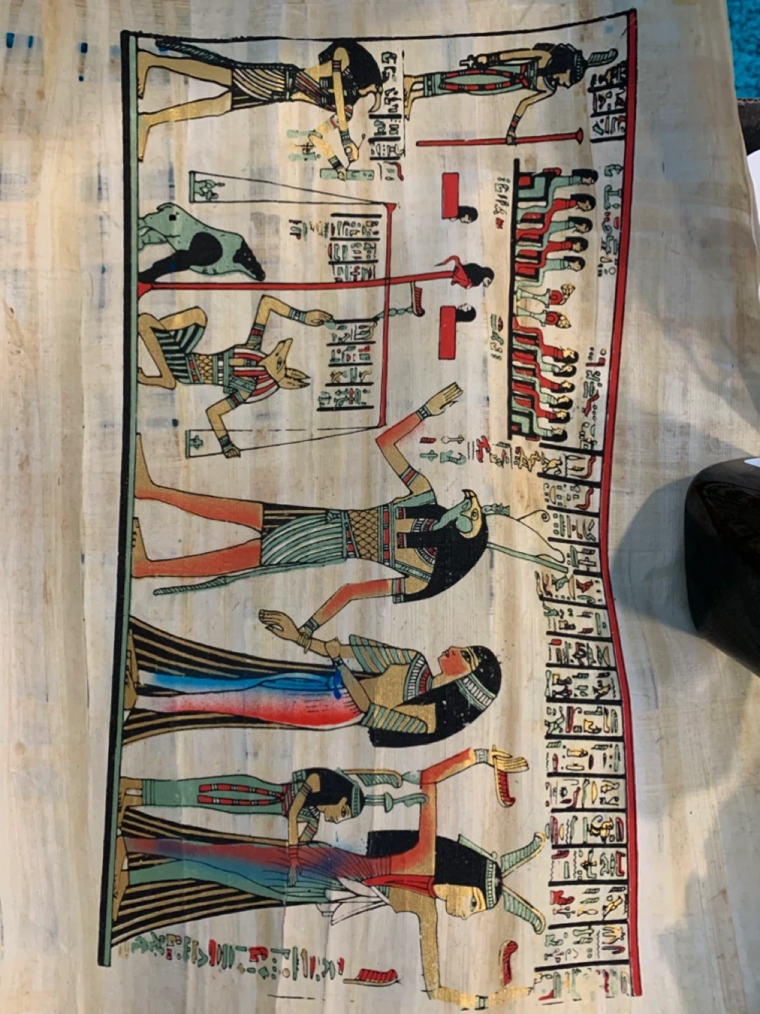 Here's a lovely Egyptian papyrus painting. It depicts figures and hieroglyphs in a traditional style. A great piece for adding some culture to your home!