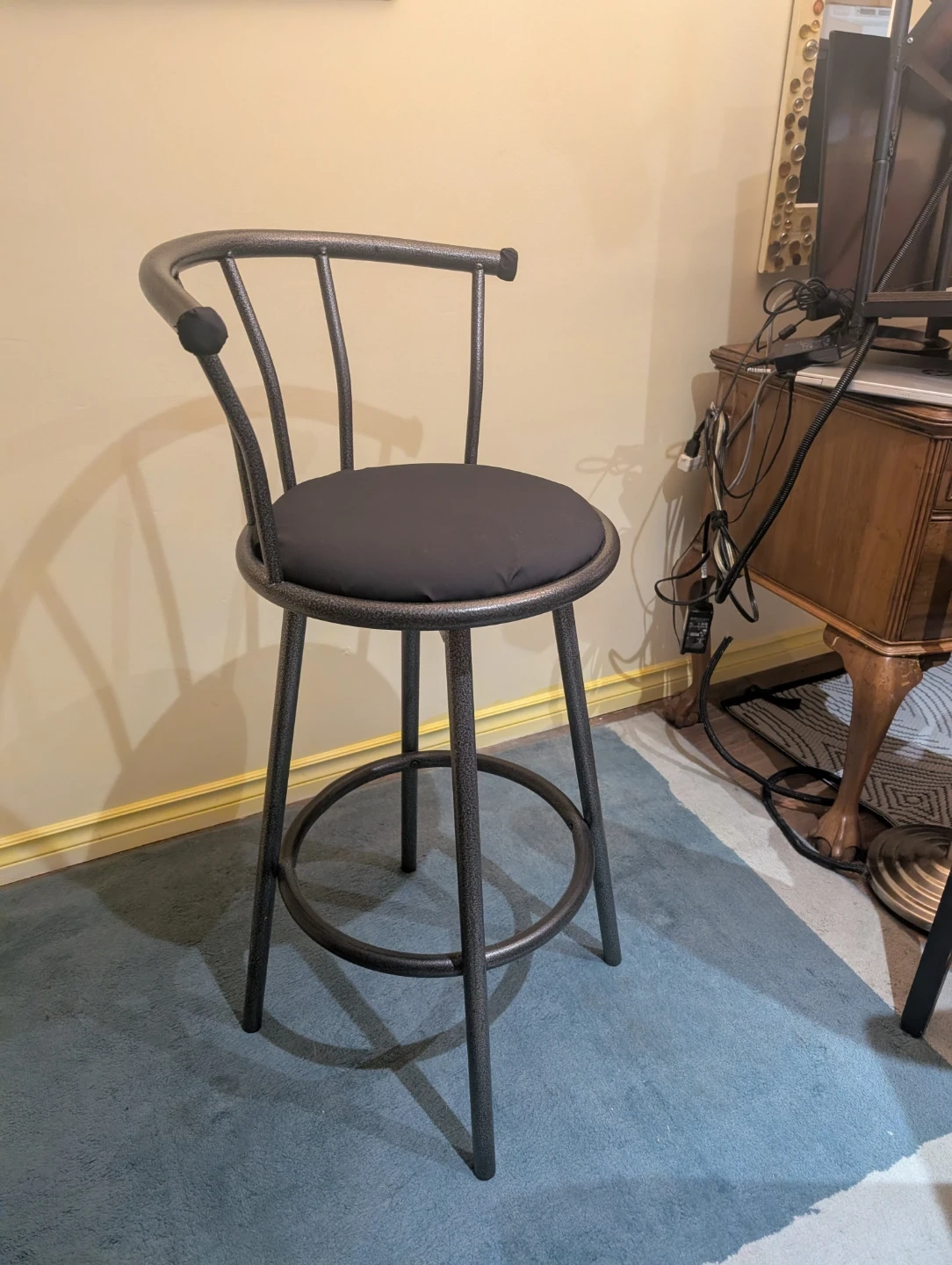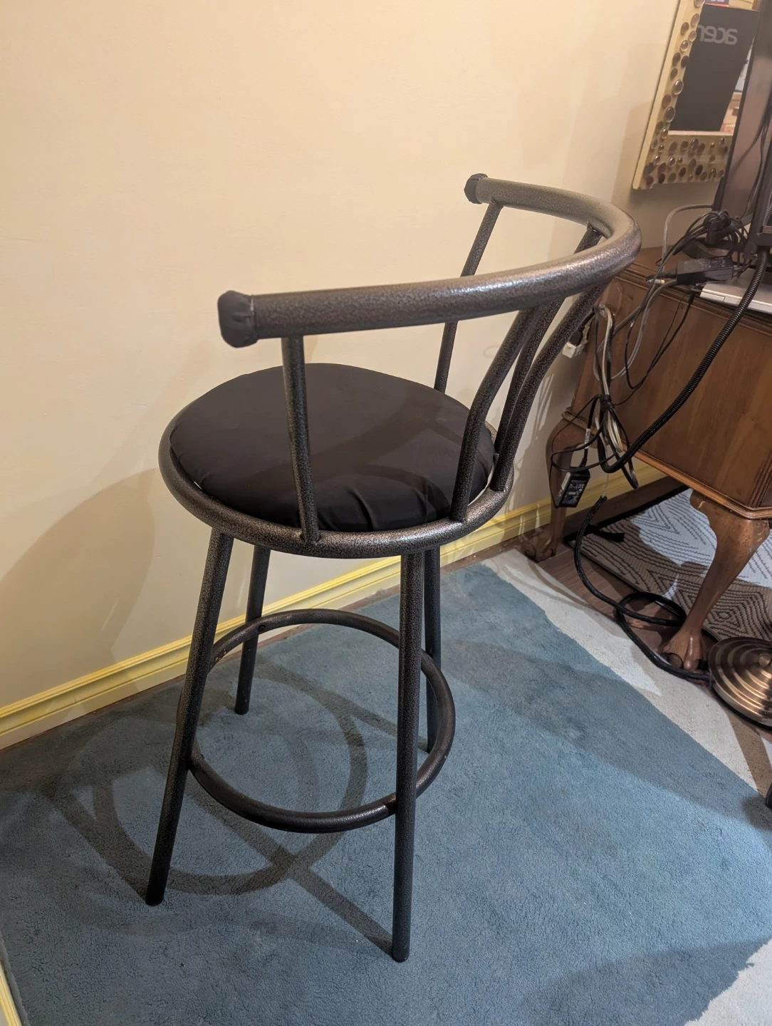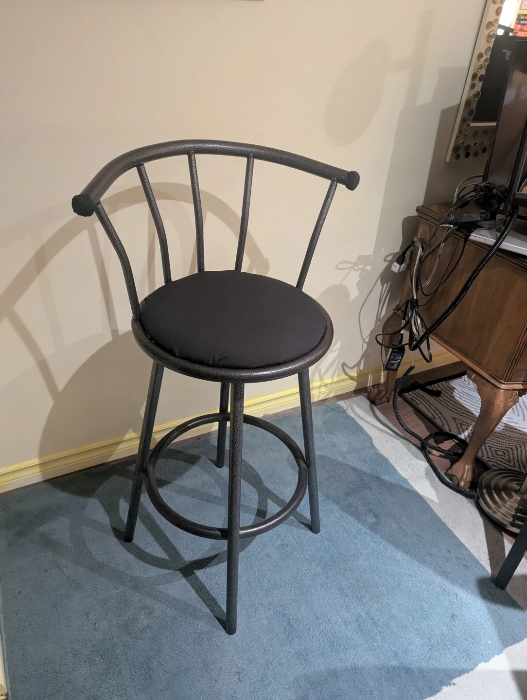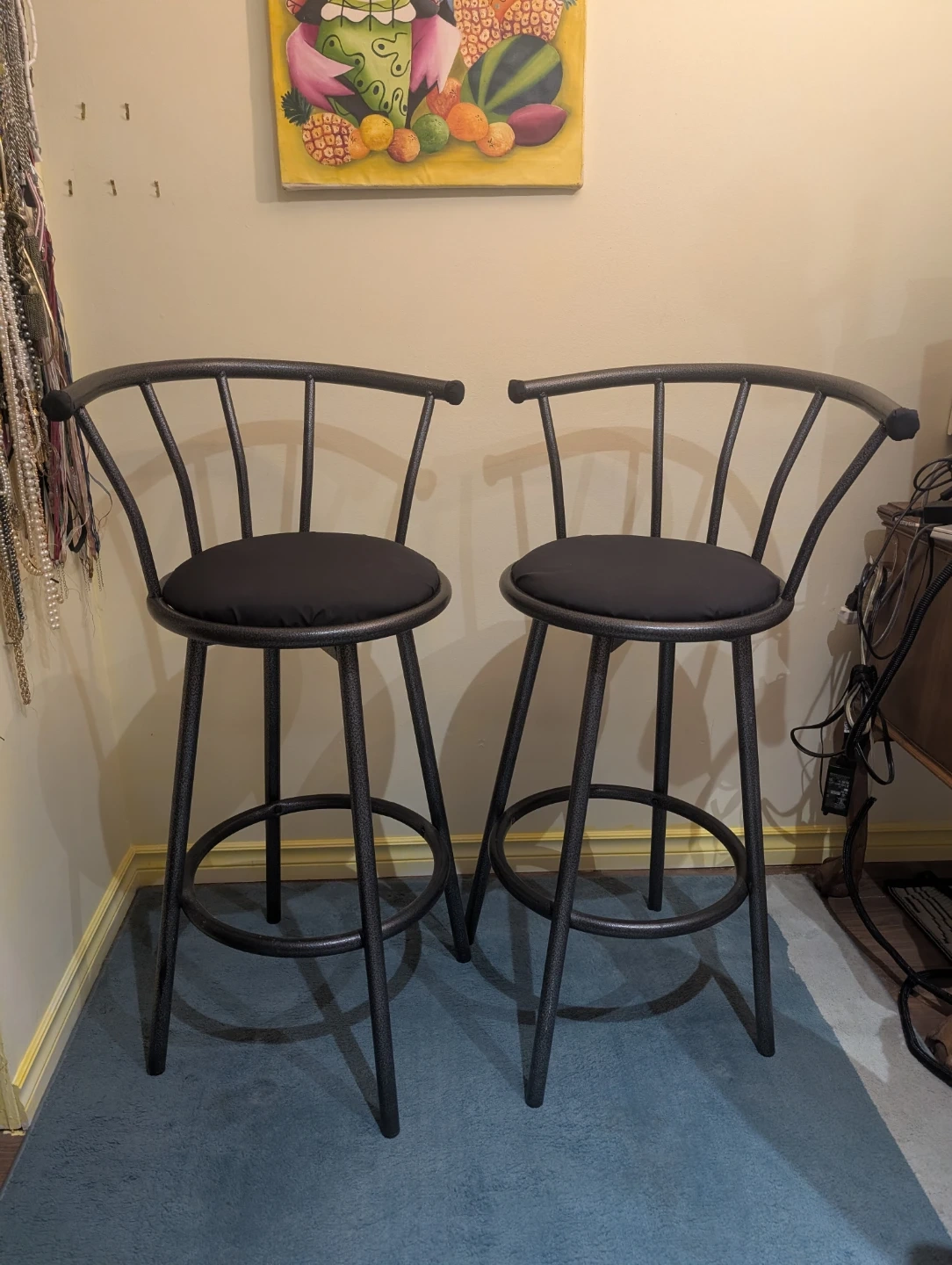 Set of 2 sturdy, modern black metal bar stools with cushioned seats and footrests. Clean, solid, and very comfortable. Great for kitchen islands, bars, or studio spaces. ✅ Swivel seats ✅ Padded cushions ✅ Heavy-duty metal frame ✅ Smoke-free home Measurements a seen in last photo. Seat Height: 70" Total Height: 99" Seat diameter: 14" $80 for the pair. Pickup only. Located in East Vancouver.