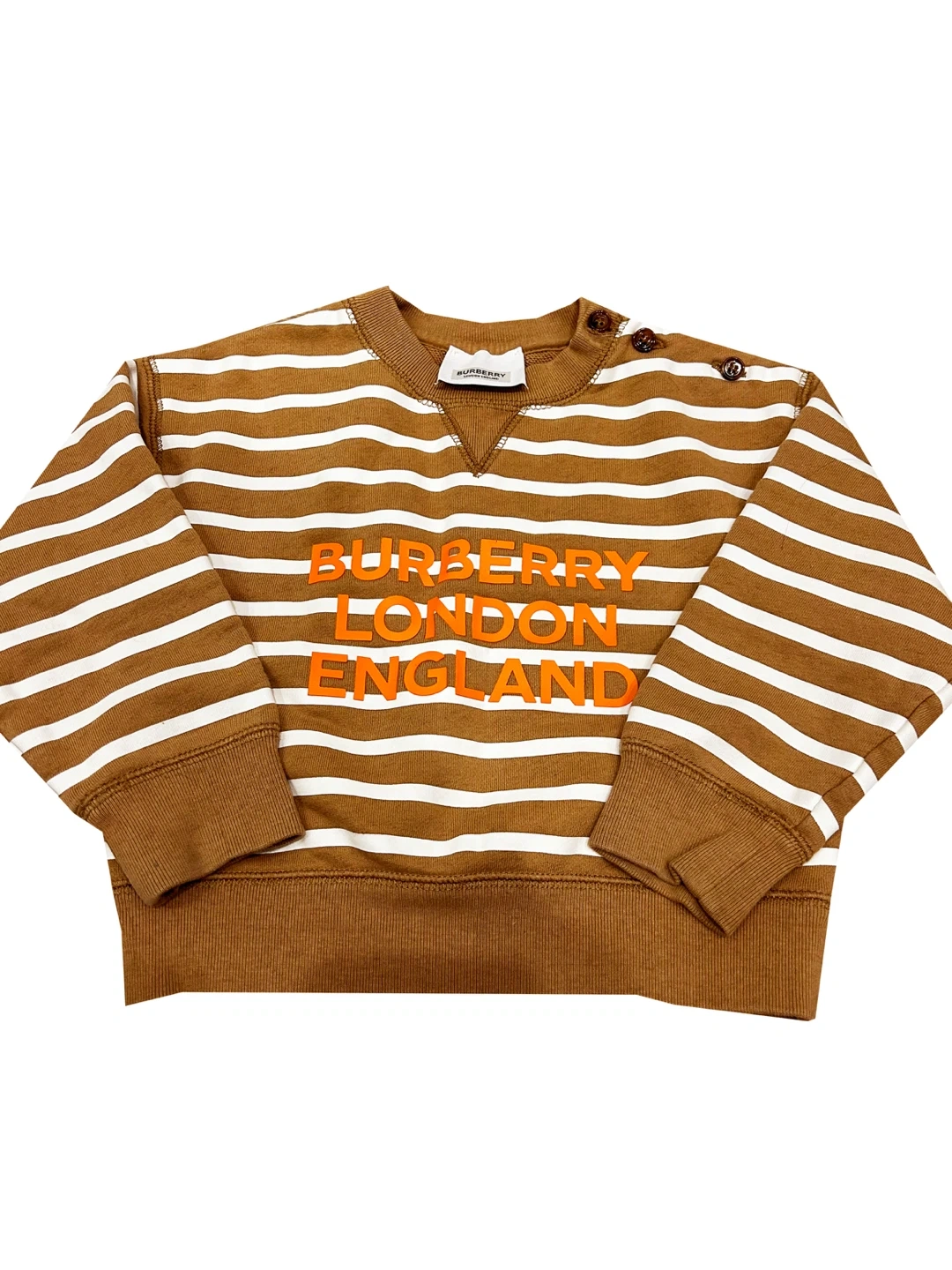 This Burberry kids' sweater is in great condition and ready for a new home! It's a brown and white striped sweater with "BURBERRY LONDON ENGLAND" in orange lettering across the chest. The size is 2Y (92cm). Super cute and comfy for your little one!