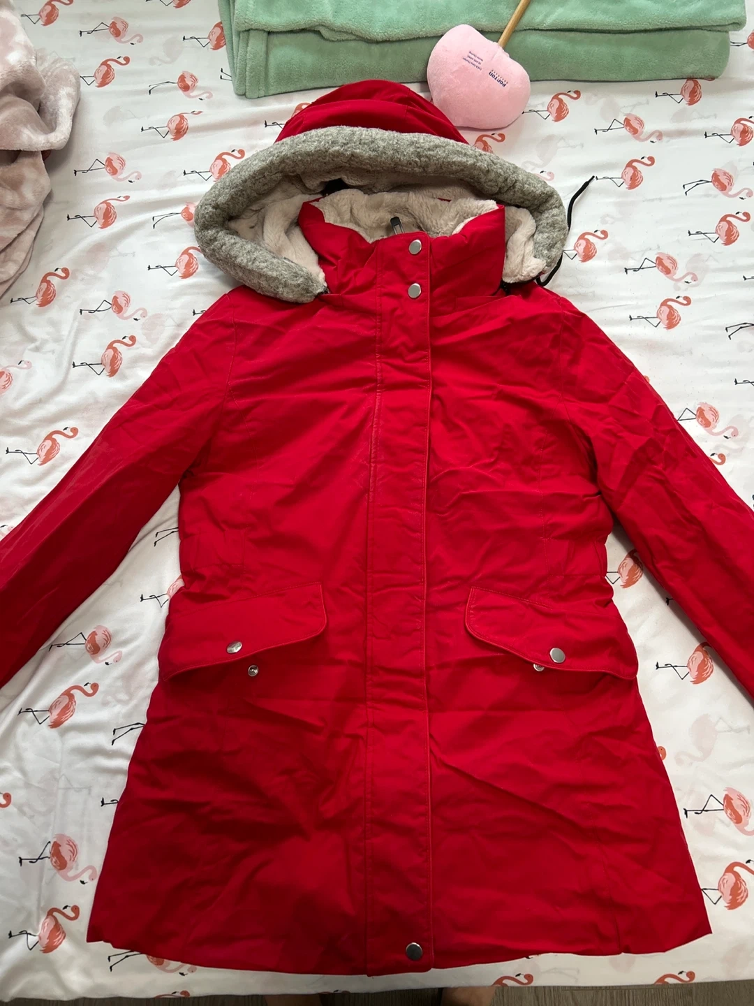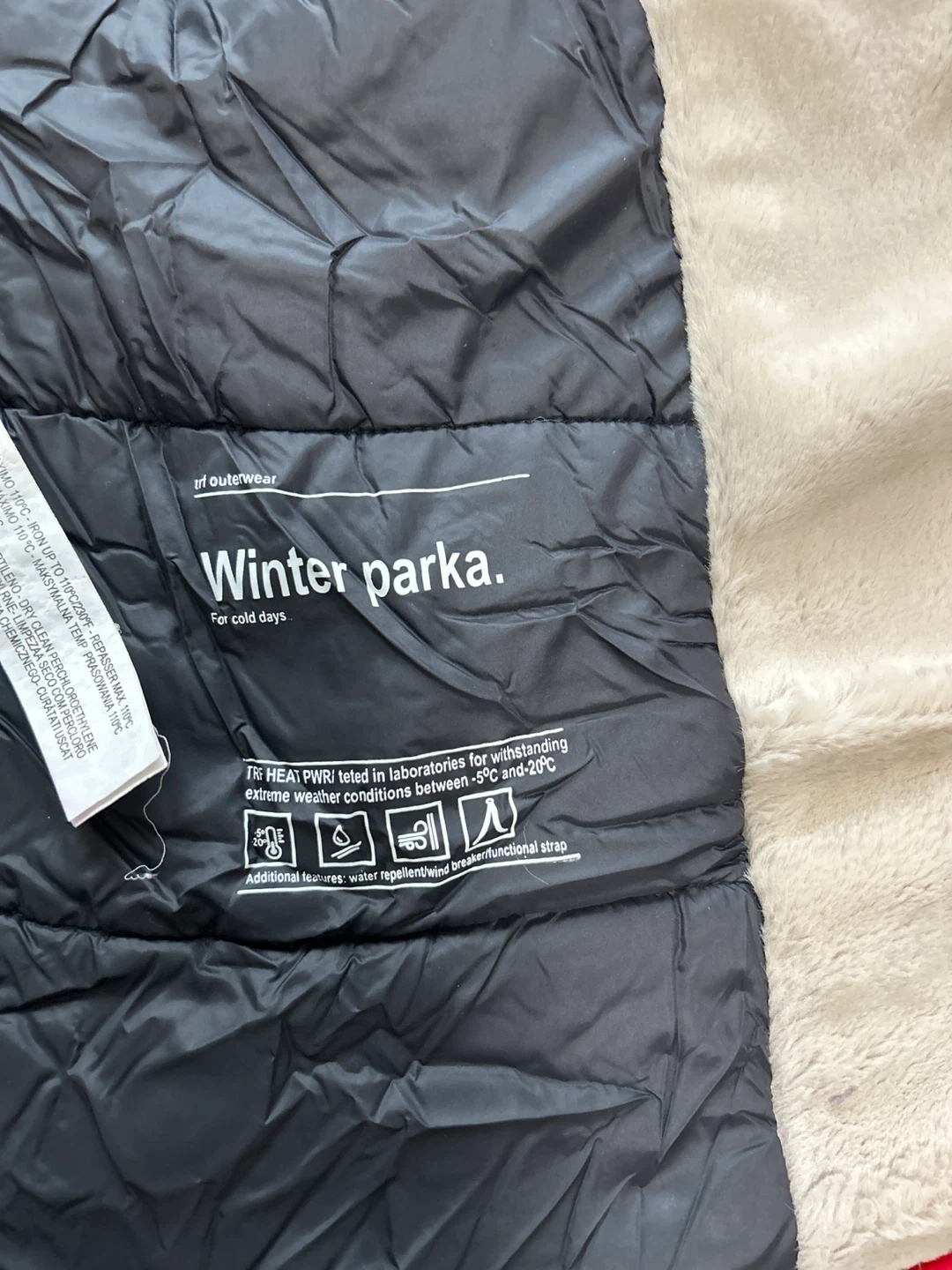 Selling a Zara winter parka in great condition! It's a size small and perfect for cold days. The parka is red and has a faux fur lining. It's designed to withstand extreme weather conditions between -5°C and -20°C. It also features a water-repellent finish and a functional strap