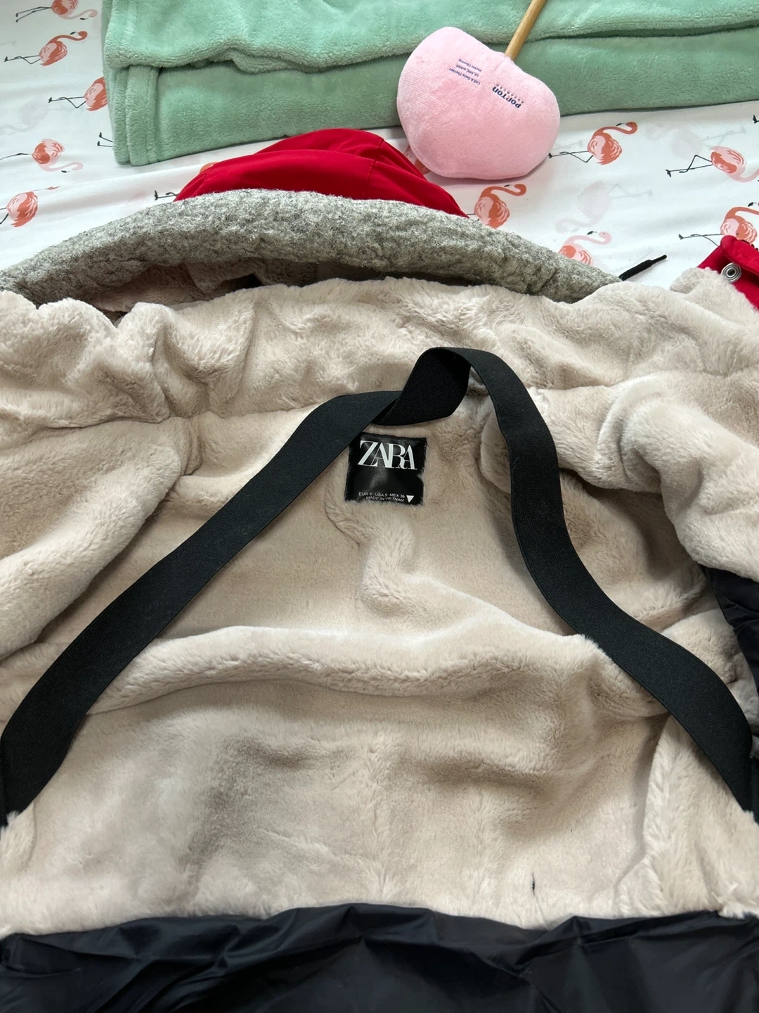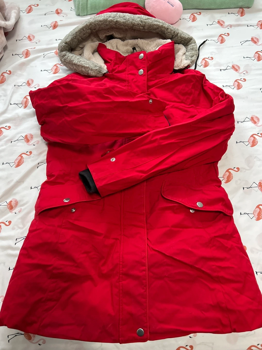 Selling a Zara winter parka in great condition! It's a size small and perfect for cold days. The parka is red and has a faux fur lining. It's designed to withstand extreme weather conditions between -5°C and -20°C. It also features a water-repellent finish and a functional strap