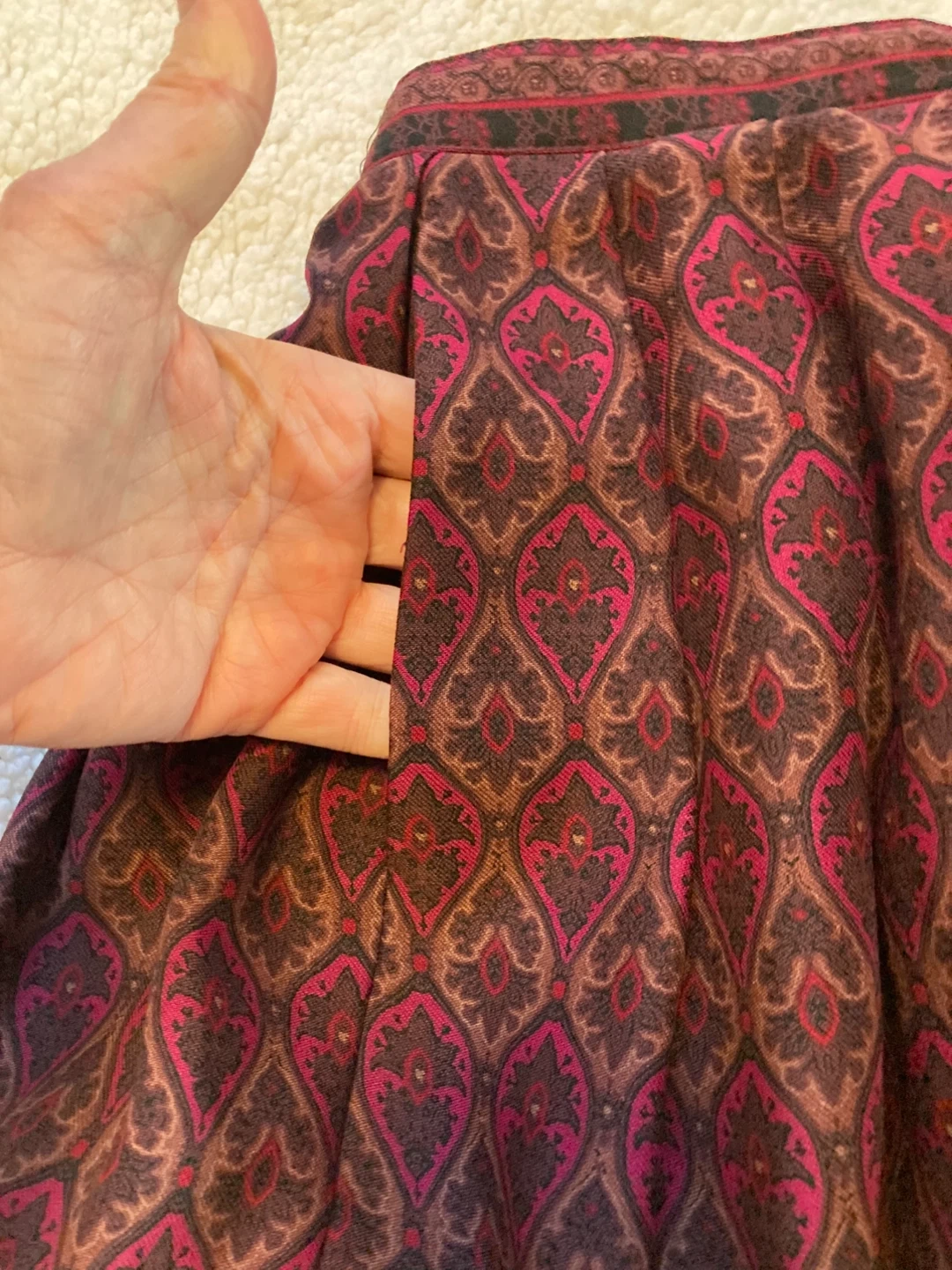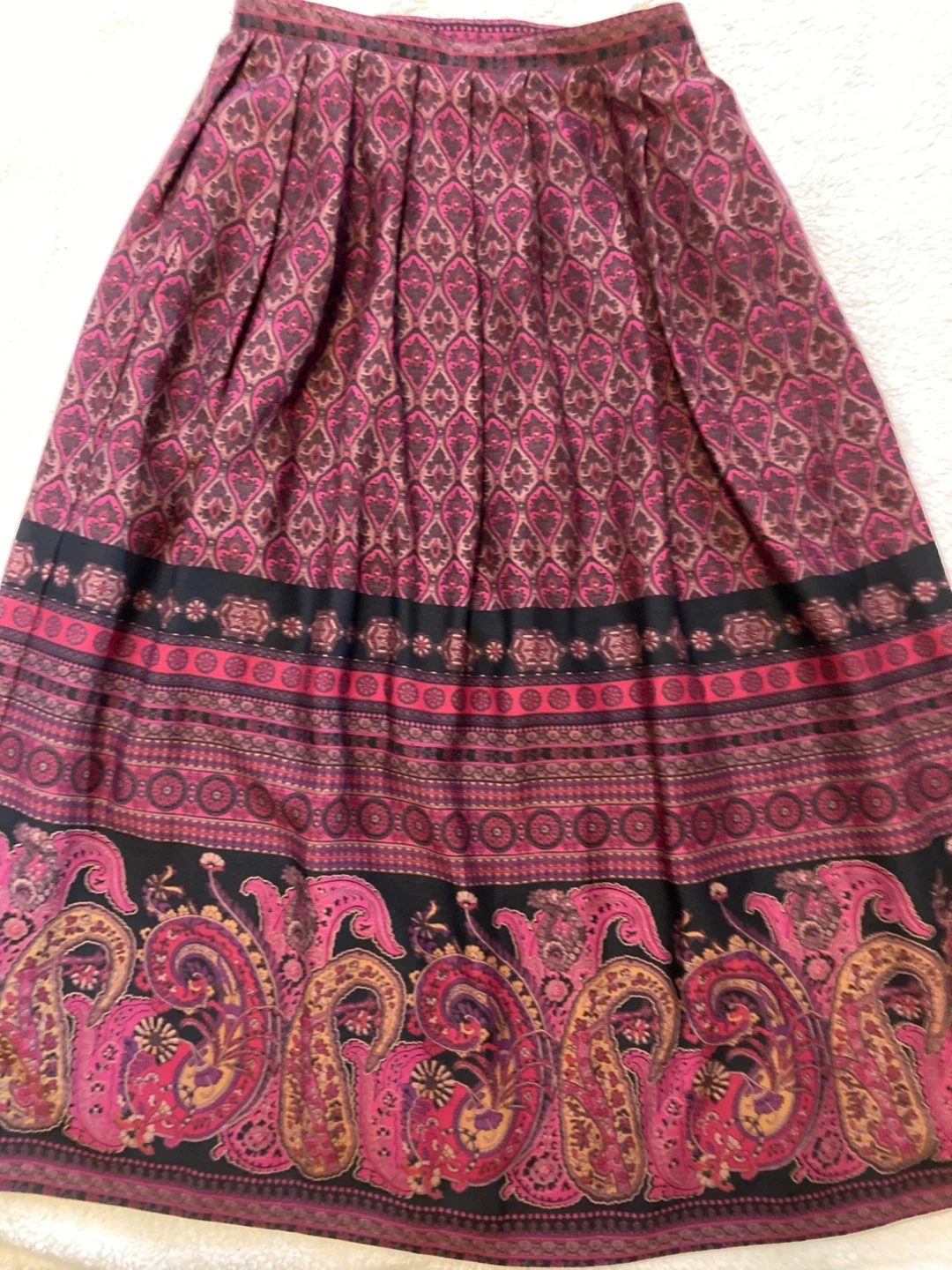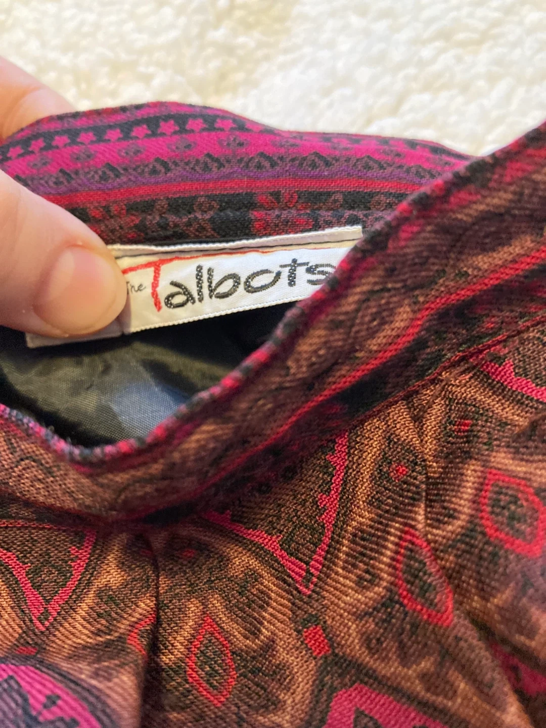 This size 4 to 6 skirt from Talbots has a beautiful paisley print in high quality wool fabric. Vintage and of a quality no longer achieved in contemporary manufacturing. It's fully lined and includes pockets. In pristine line-new condition. Perfect for adding a pop of colour and pattern to your wardrobe!