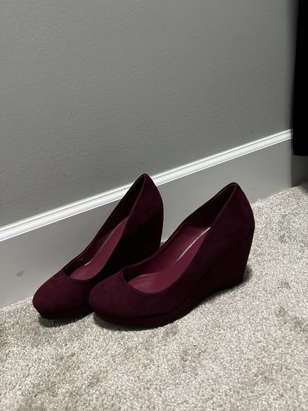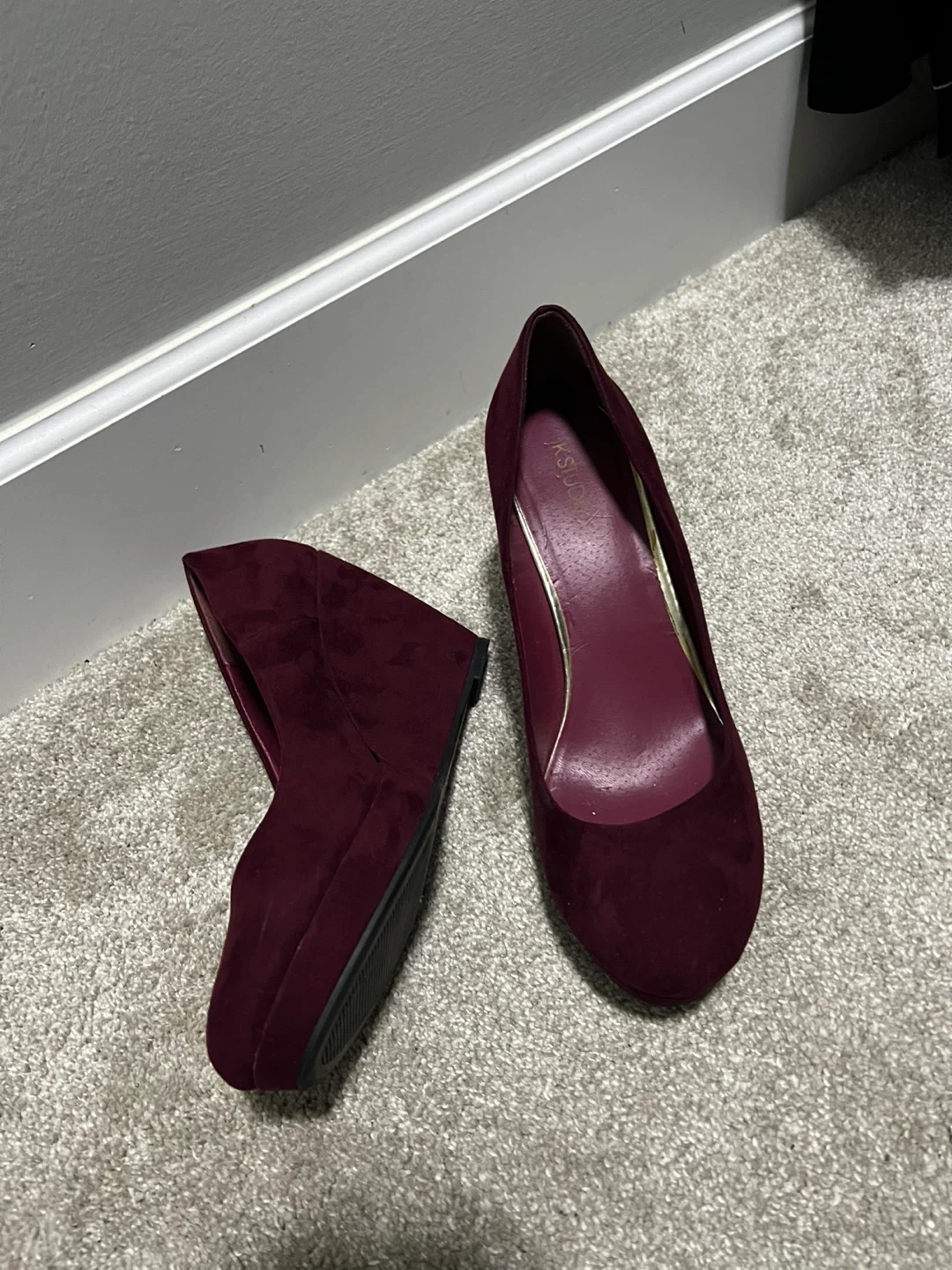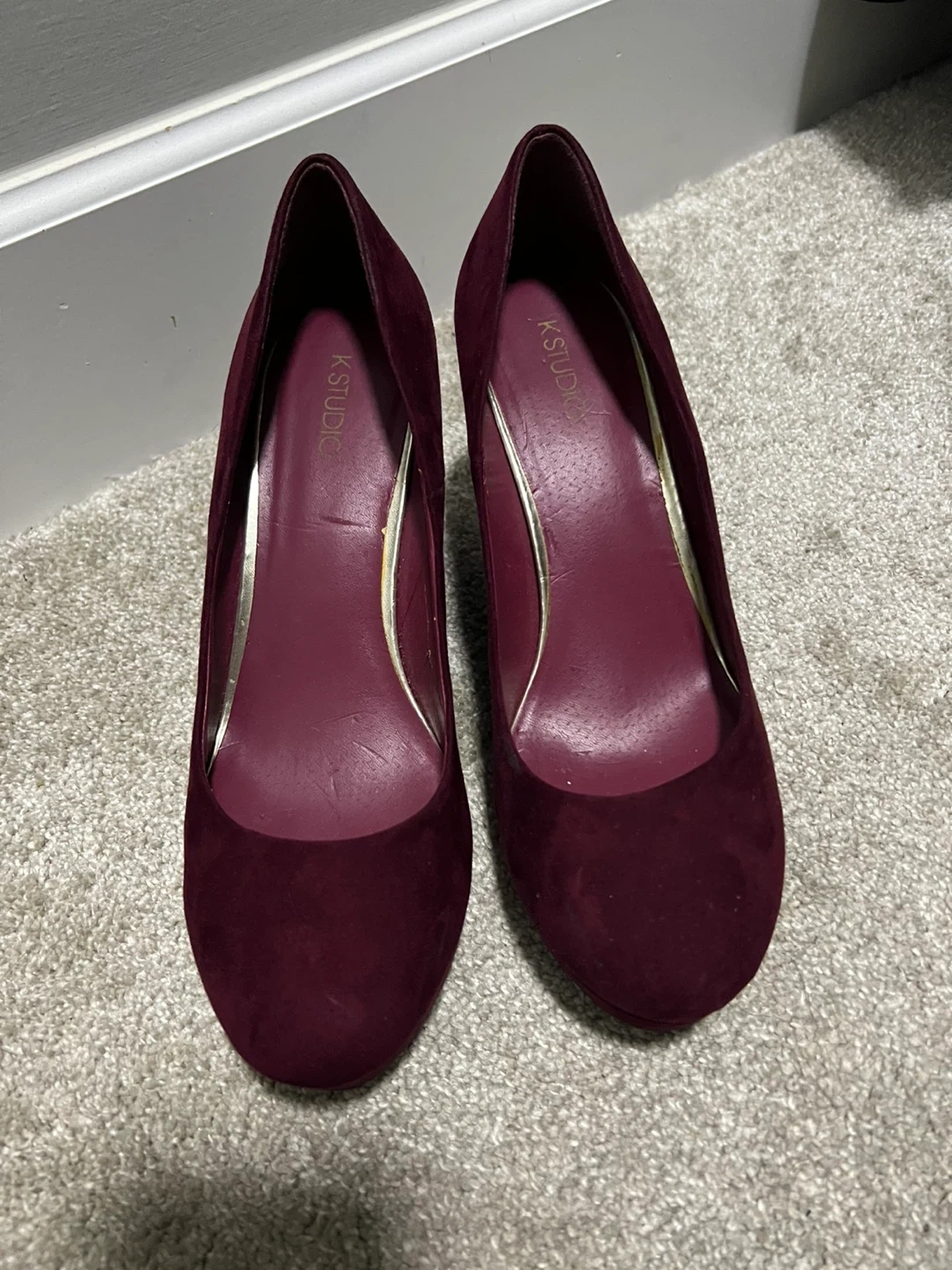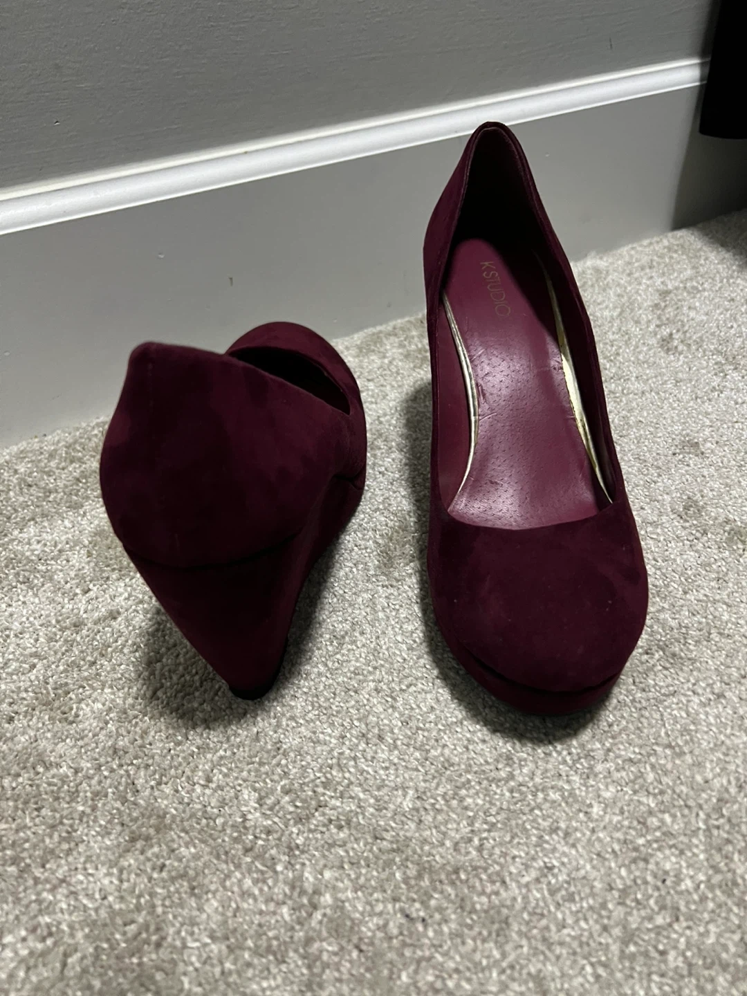 Selling a pair of new KStudio wedge heels in a lovely burgundy colour. They are a size 8.5. These stylish shoes are perfect for adding a touch of elegance to any outfit!