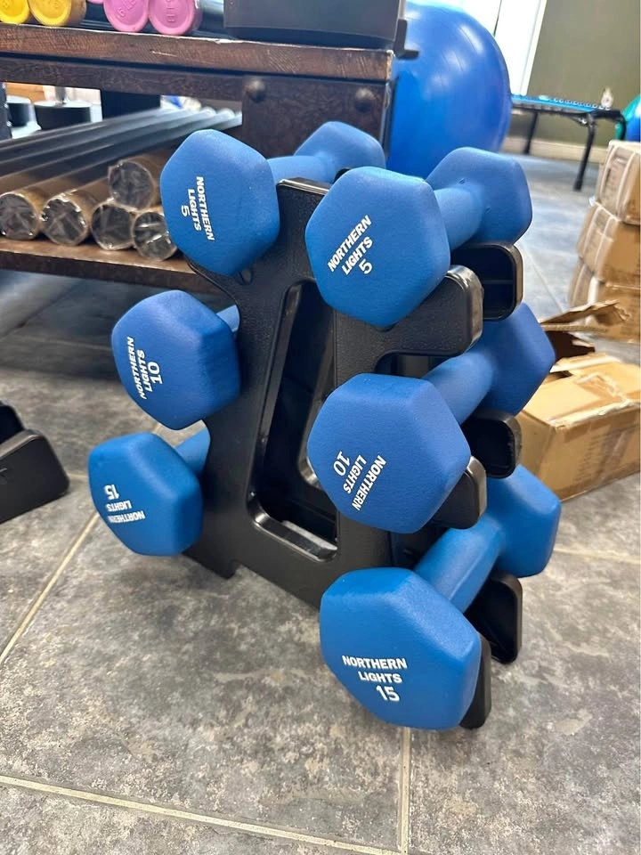 Upgrade your workouts at home with this Northern Lights dumbbell set + rack. Compact, durable, and perfect for strength training or toning.