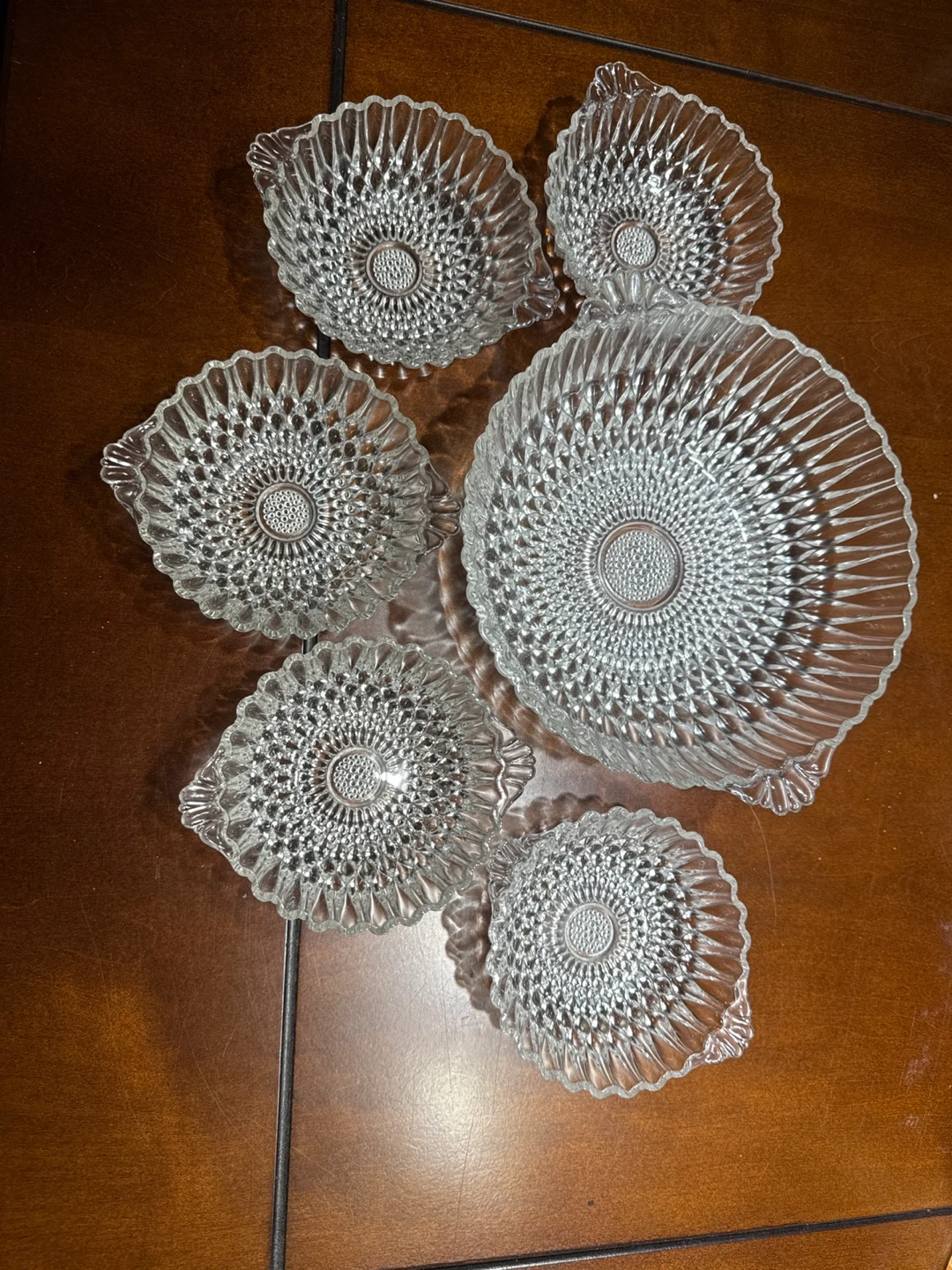 Selling a set of five vintage clear glass serving bowls. They feature a lovely, intricate design. Perfect for adding a touch of elegance to your table setting!