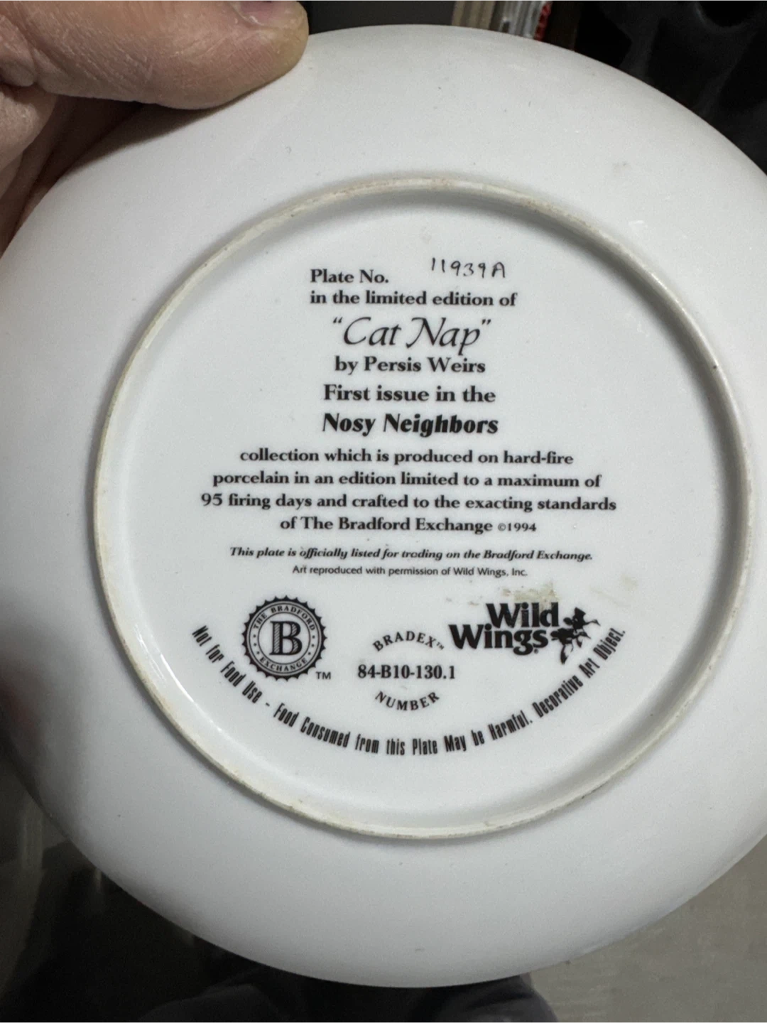 Selling a lovely Bradex collector plate titled 'Cat Nap' by Persis Weirs. It's the first issue in the Nosy Neighbors collection. The plate is produced on hard-fire porcelain and crafted to the exacting standards of The Bradford Exchange. A charming decorative art object!