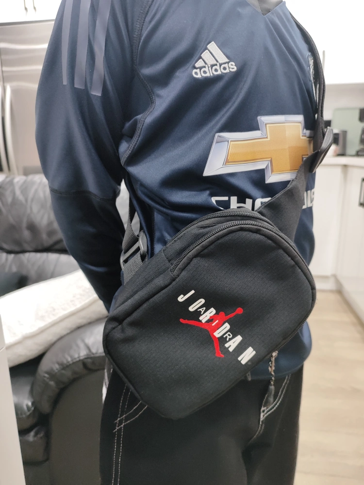 Selling a Jordan waist bag in black! It's in great condition and perfect for carrying your essentials. The iconic Jordan logo is embroidered on the front