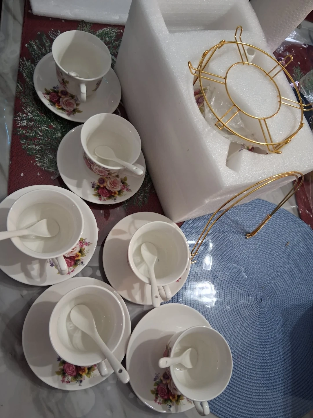 I'm selling a beautiful floral tea set. It includes a teapot, six cups, six saucers, and six spoons. The set also comes with a gold-colored metal stand for display. The teapot holds approximately 29.76 oz, and each cup holds about 8.12 oz. The cups are decorated with a lovely floral design. Perfect for tea parties or adding a touch of elegance to your home!