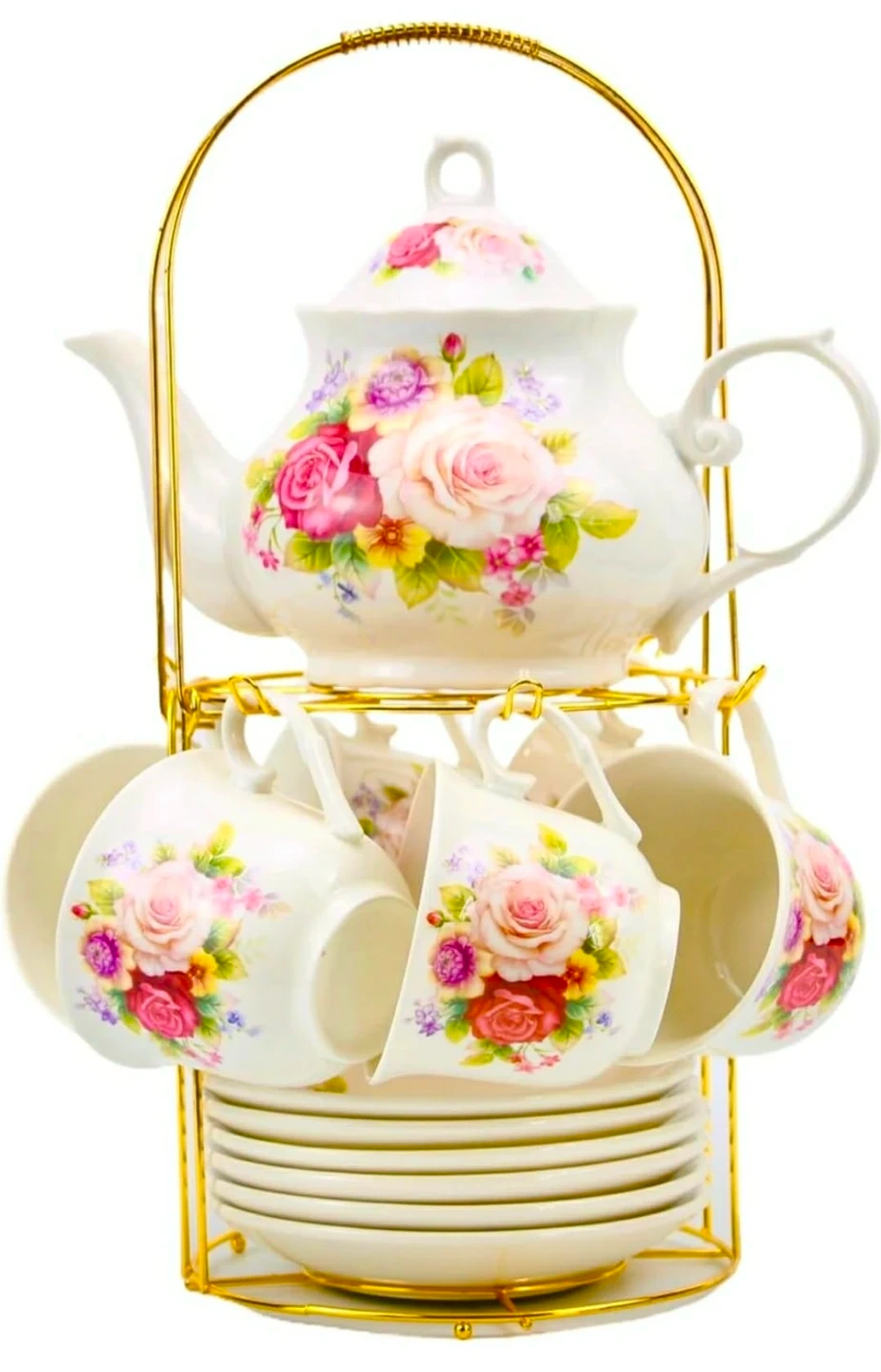 I'm selling a beautiful floral tea set. It includes a teapot, six cups, six saucers, and six spoons. The set also comes with a gold-colored metal stand for display. The teapot holds approximately 29.76 oz, and each cup holds about 8.12 oz. The cups are decorated with a lovely floral design. Perfect for tea parties or adding a touch of elegance to your home!