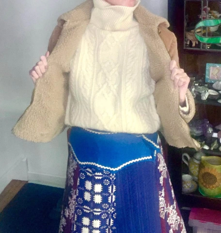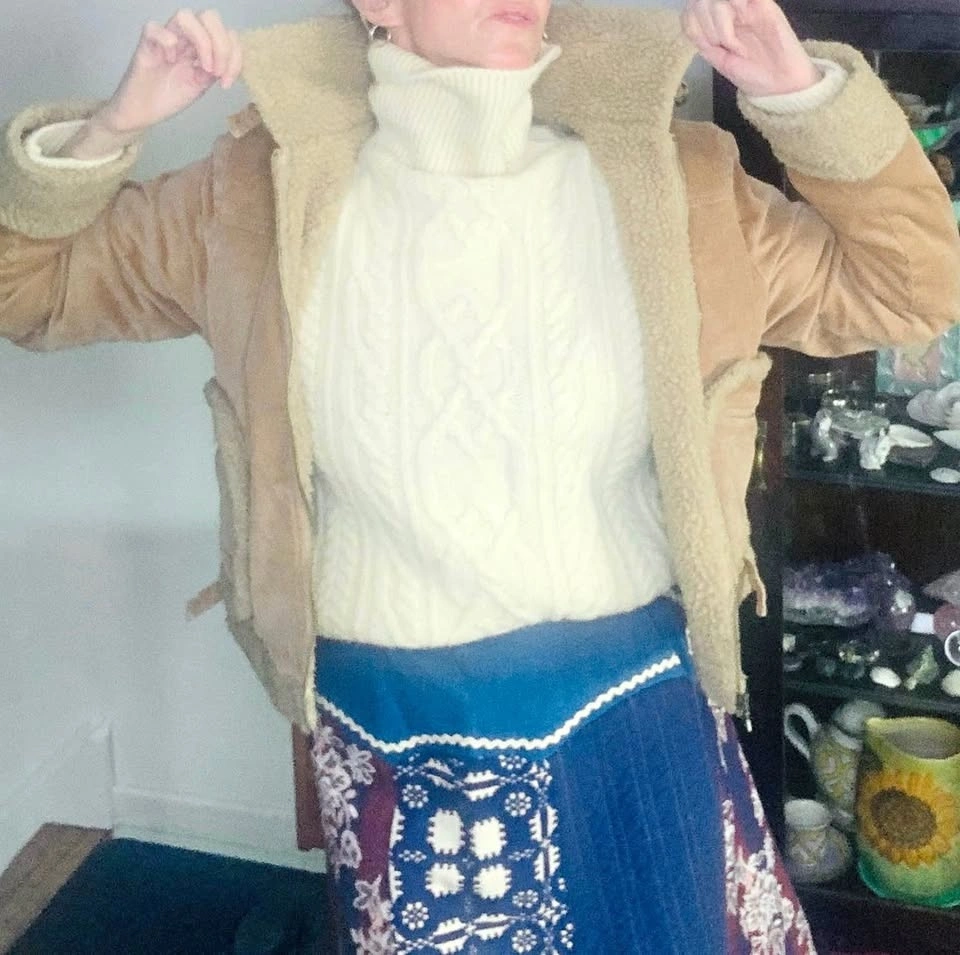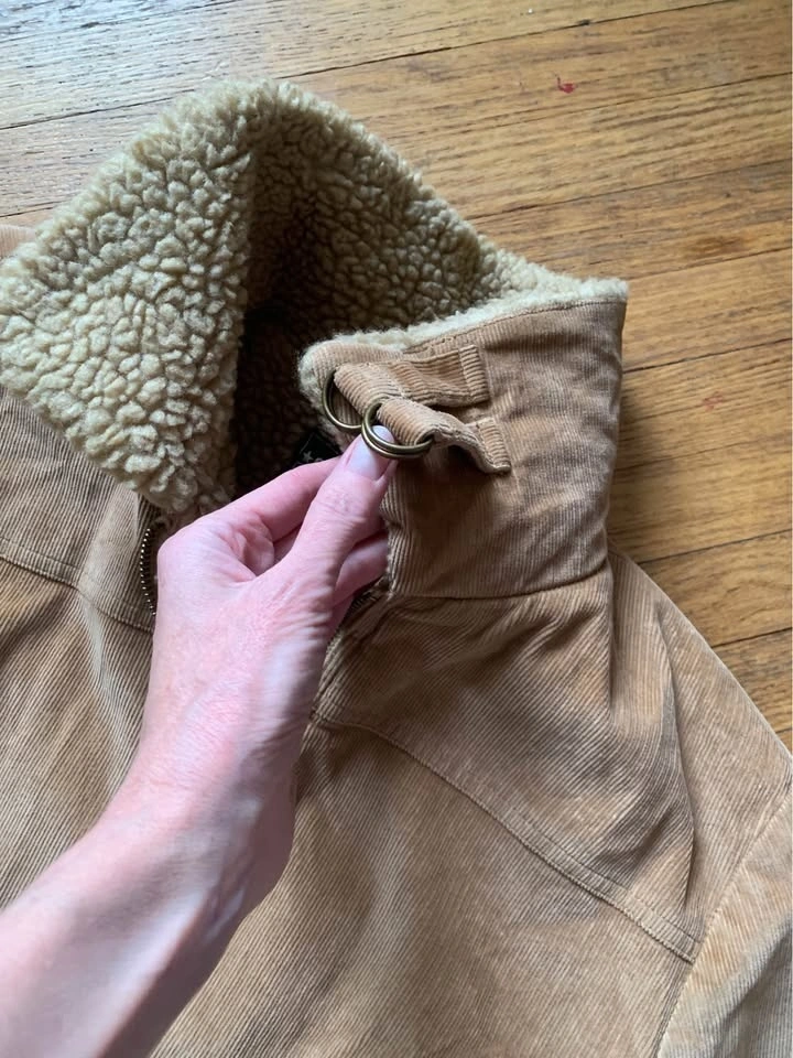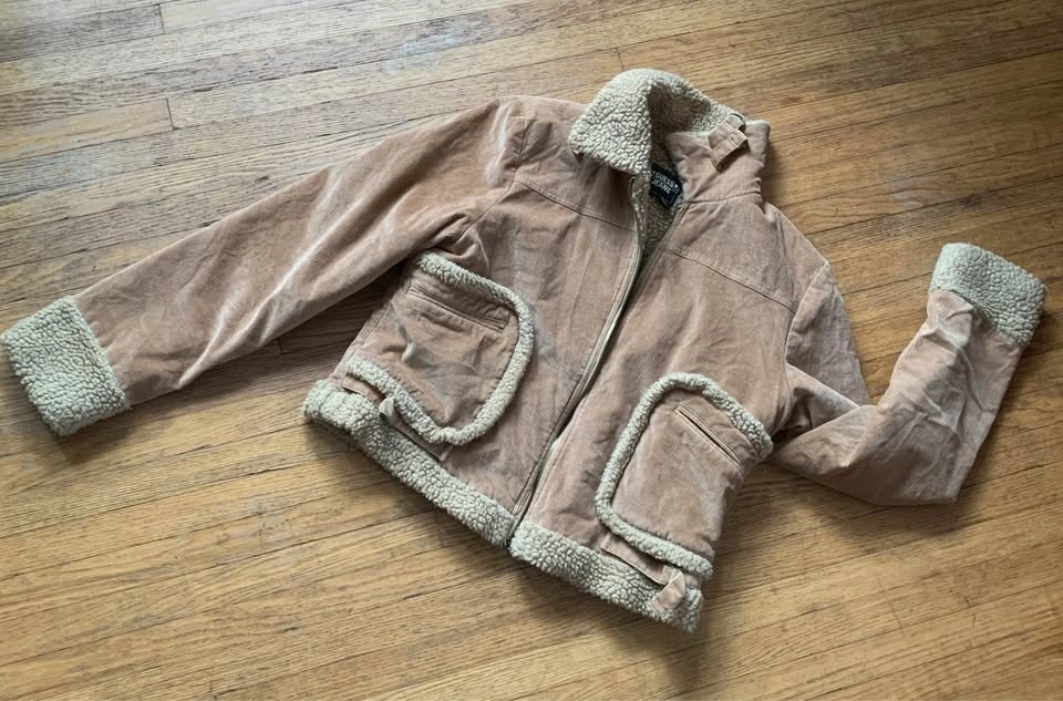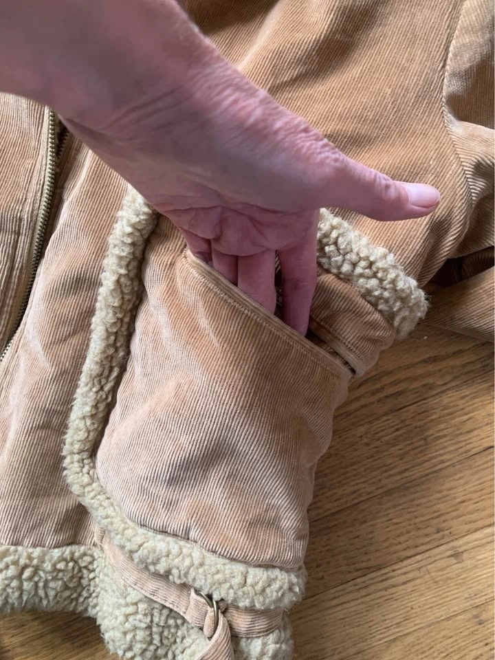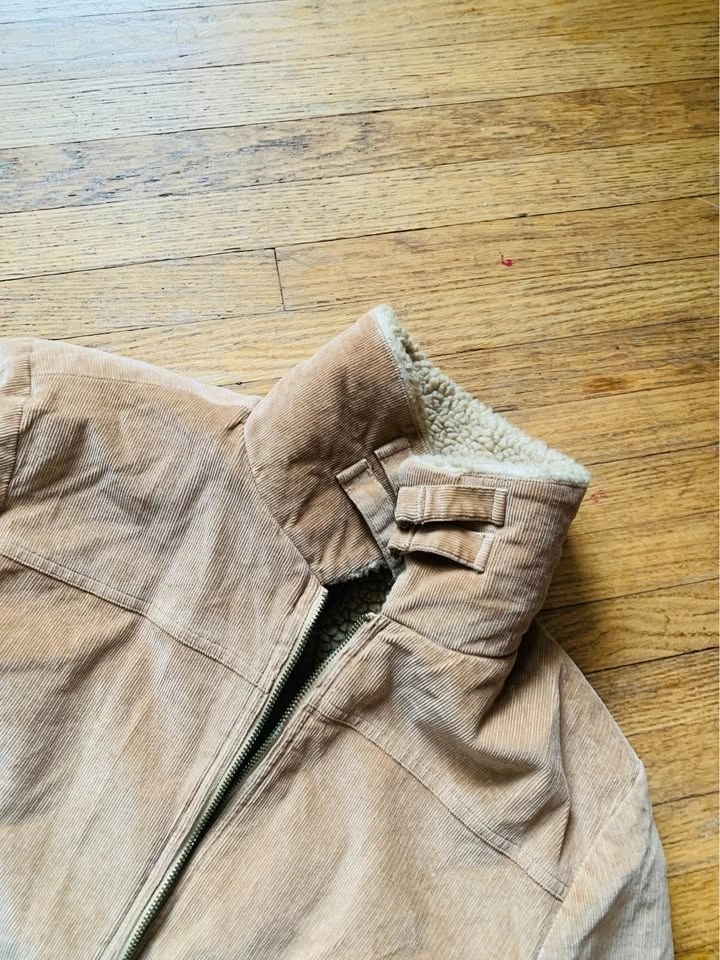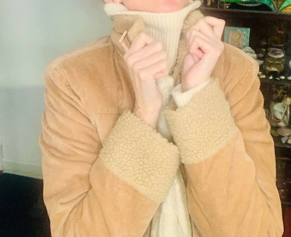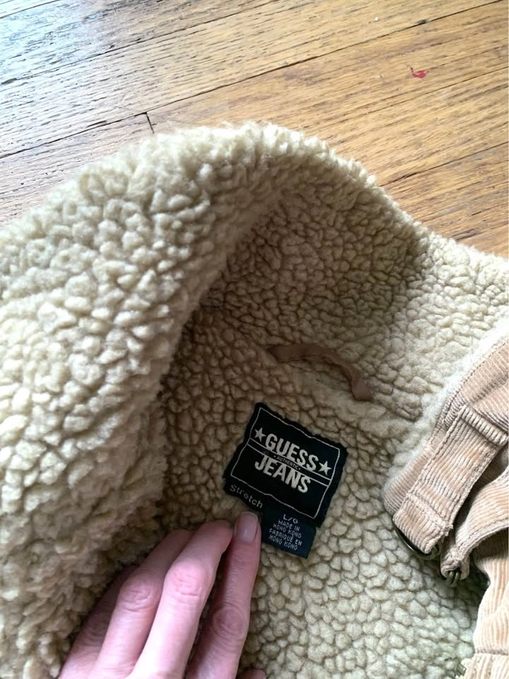 This vintage Penny Lane GUESS coat is so cute, warm and cosy! It is a velvety tan corduroy with a beige faux shearling interior. The neck stands up high and buckles, or is very supple to fold down. It has two front pockets that are also shearling lined. The cuffs, and the bottom of the jacket are shearling lined as well.