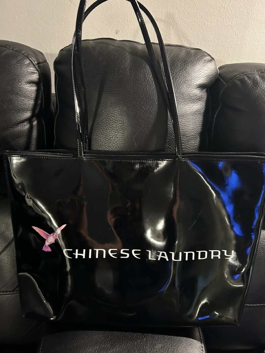 Selling a Chinese Laundry black tote bag! It's in great condition and perfect for carrying your essentials. The bag features the Chinese Laundry logo with a cute hummingbird design. 45 cm x 30 cm