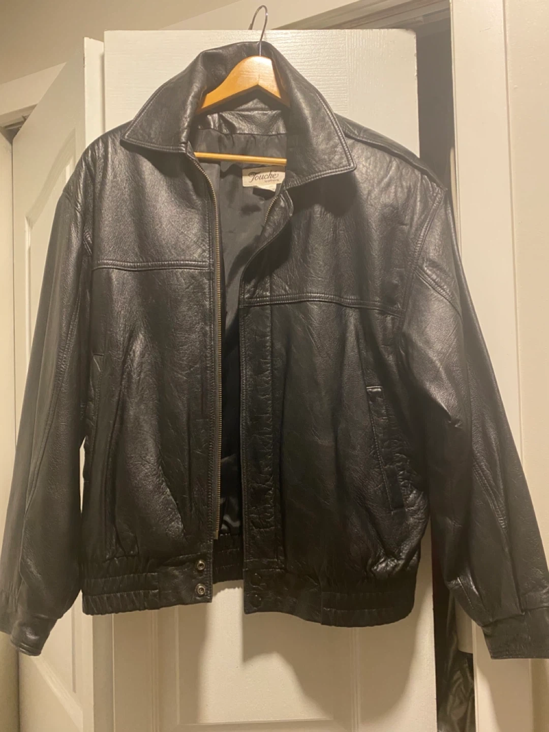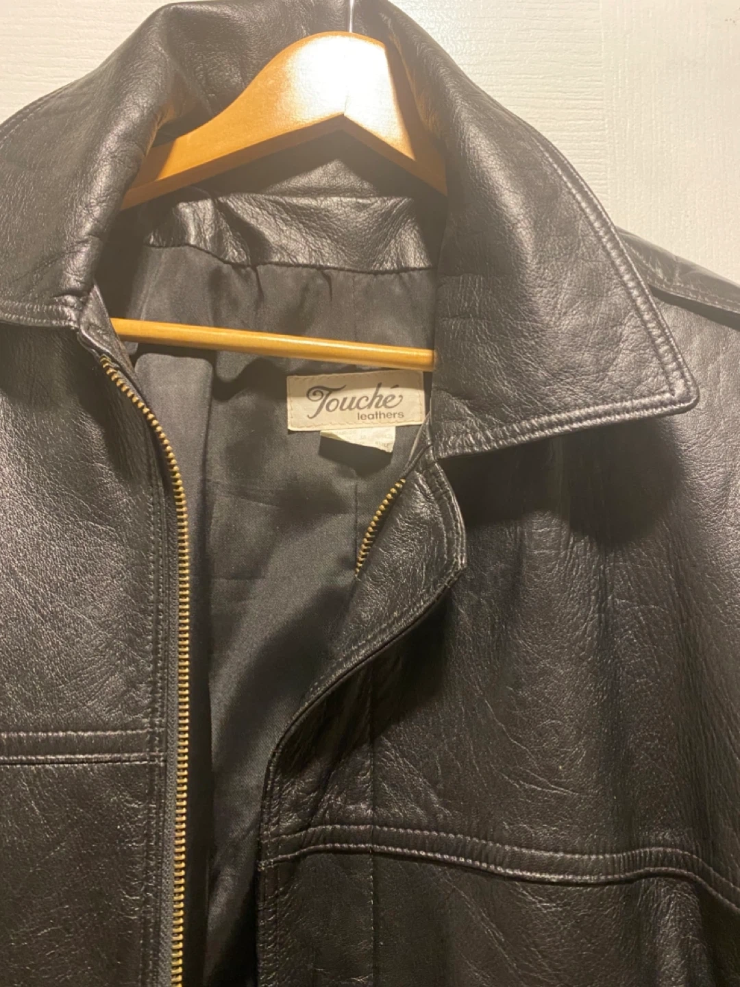 Size L. Selling a classic black leather jacket from Touche Leathers! It's in great shape and ready for a new owner.