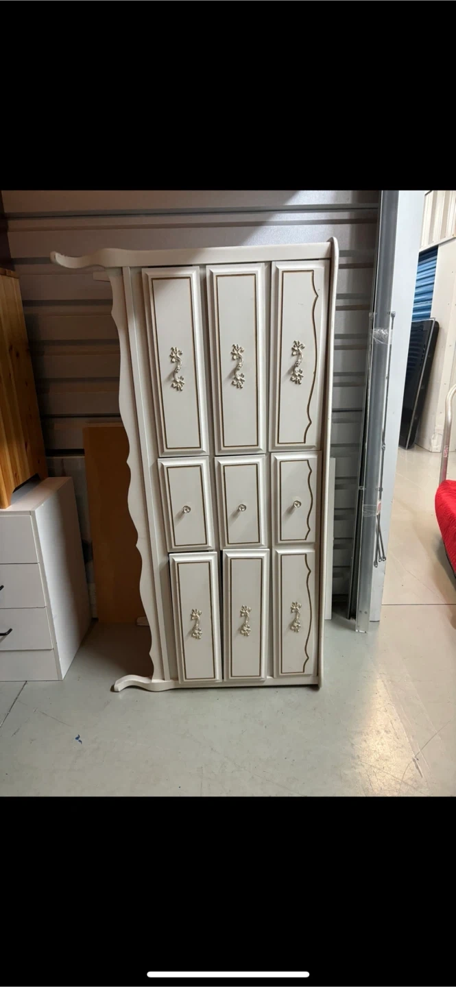 Tall vintage vanity dresser with six drawers and a matching mirror. It is white with gold accents. The dresser is in good condition but does have some minor scratches.