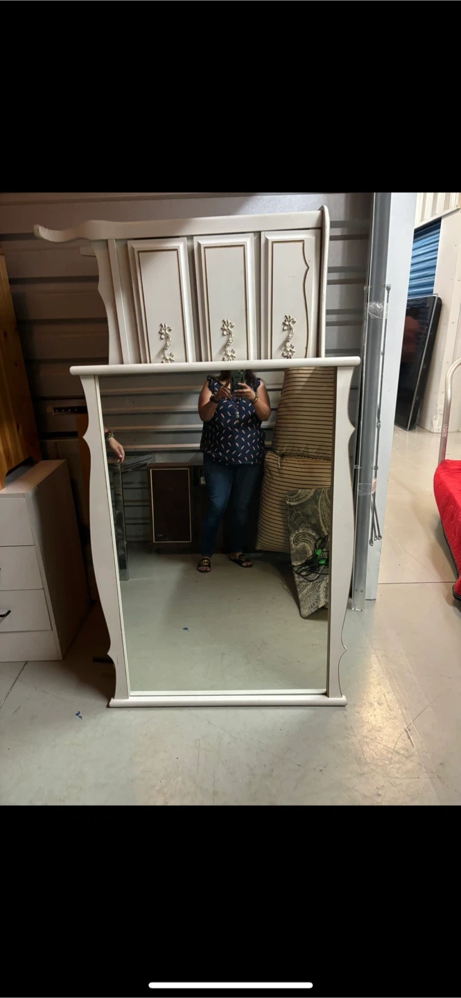 Tall vintage vanity dresser with six drawers and a matching mirror. It is white with gold accents. The dresser is in good condition but does have some minor scratches.