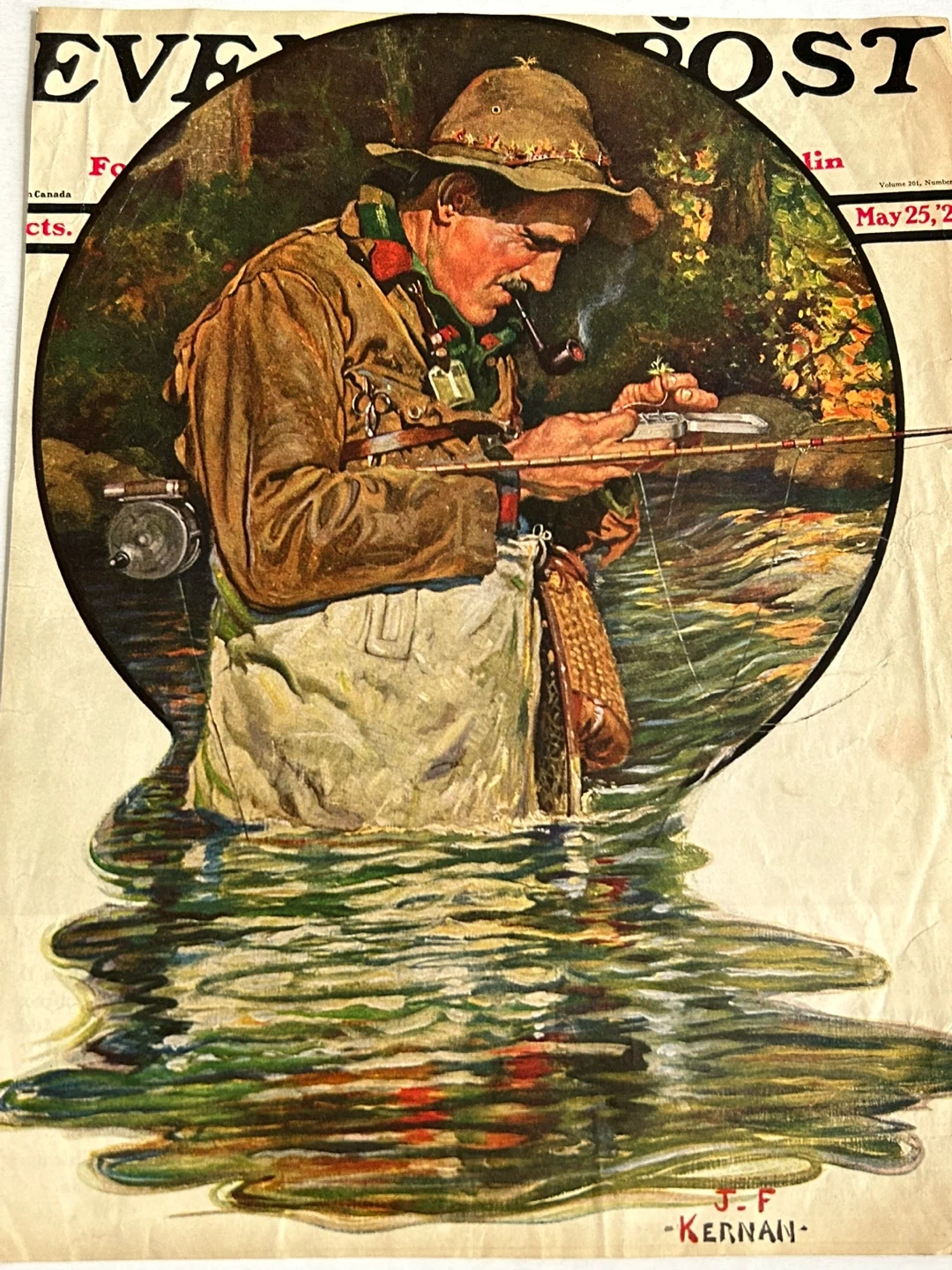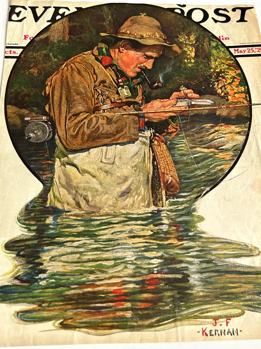 The image shows a copy of The Saturday Evening Post cover illustration titled "Tying on a Fly", by American illustrator Joseph Francis Kernan.