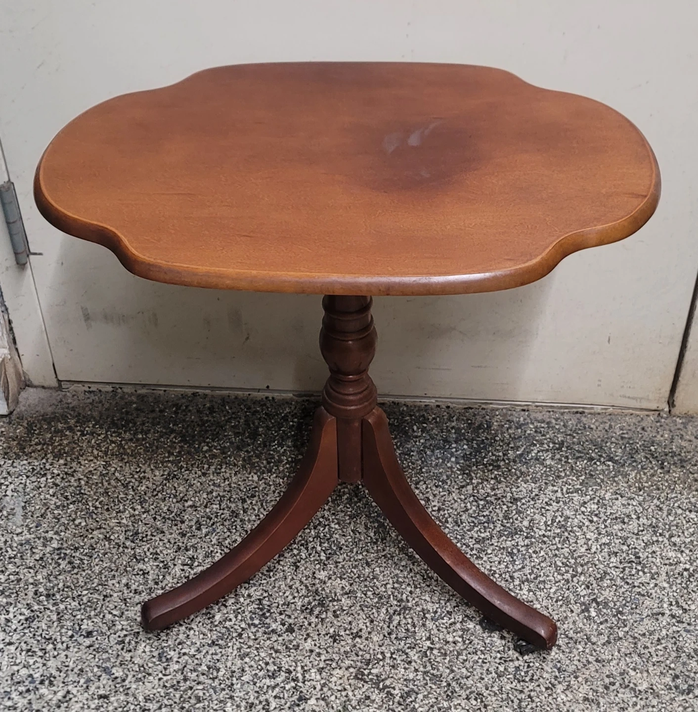 Selling a lovely vintage wooden accent table! It has a unique shape and a classic design that would look great in any room. It's in good condition and ready to add a touch of charm to your home.