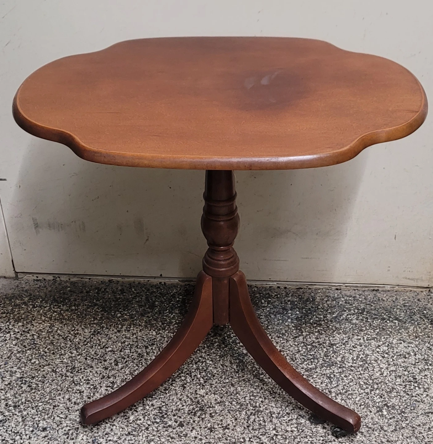 Selling a lovely vintage wooden accent table! It has a unique shape and a classic design that would look great in any room. It's in good condition and ready to add a touch of charm to your home.