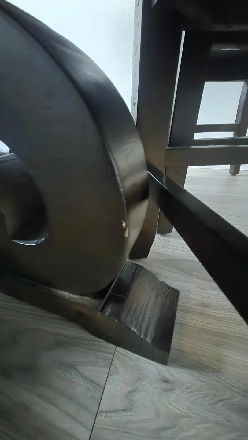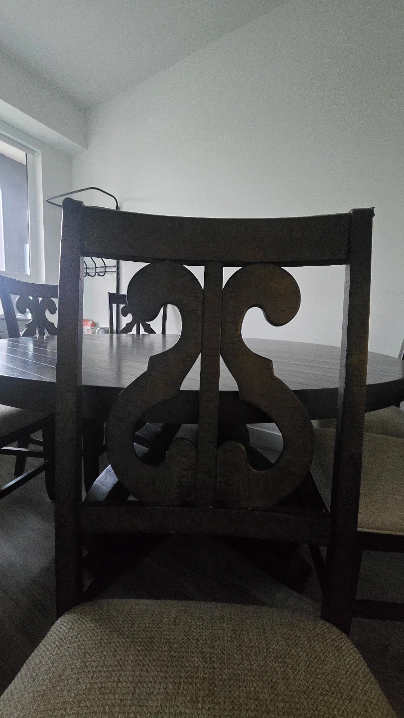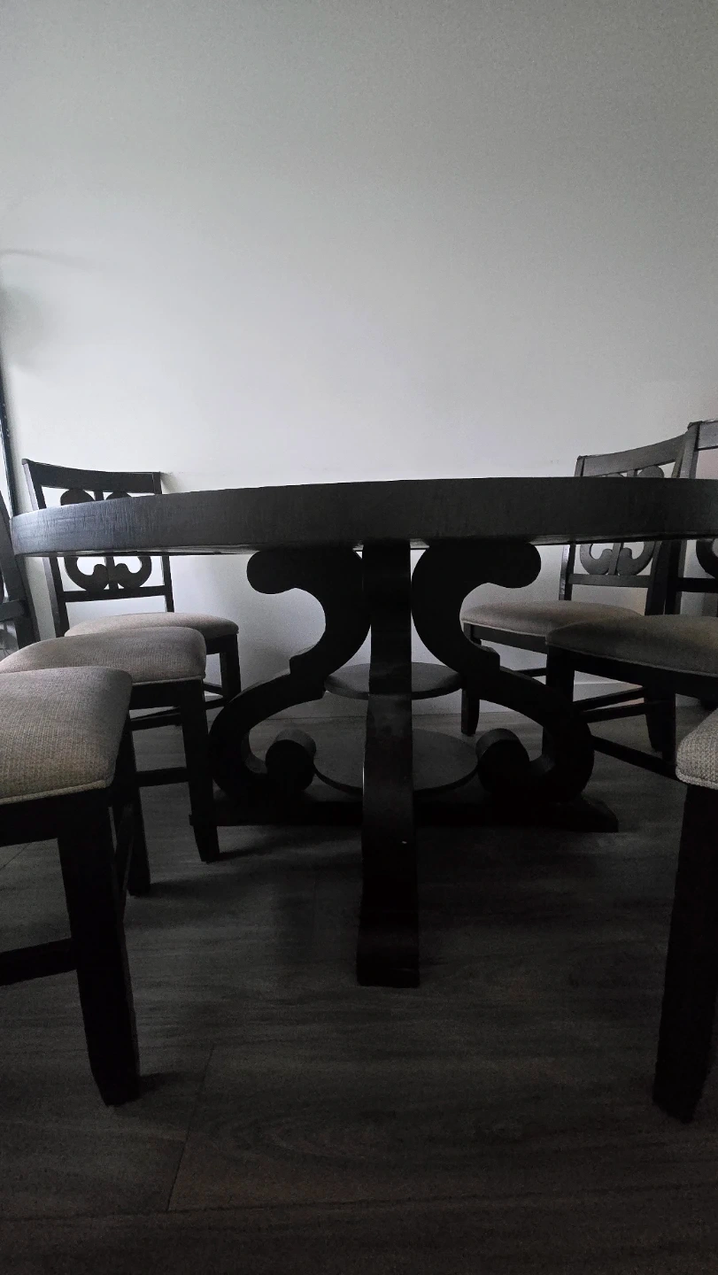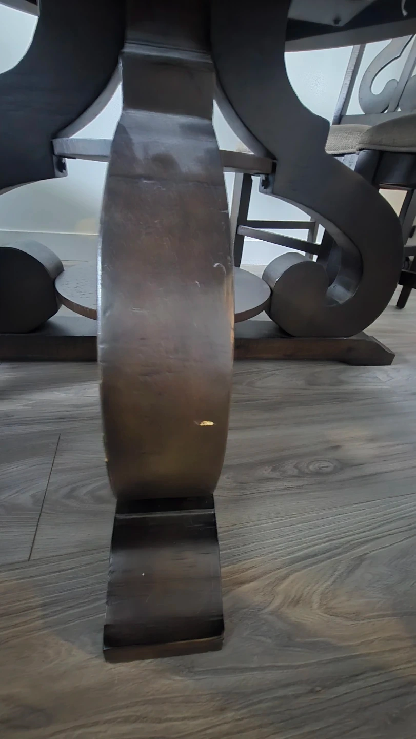 We're selling a set of six chairs, each featuring a spacious, round table with luxuriously designed legs. The chairs are luxurious and well-cushioned. The table diameter is 59.25 inches (150 cm) and the height is 30 inches (76 cm), providing ample space. There are minor scratches on the legs.