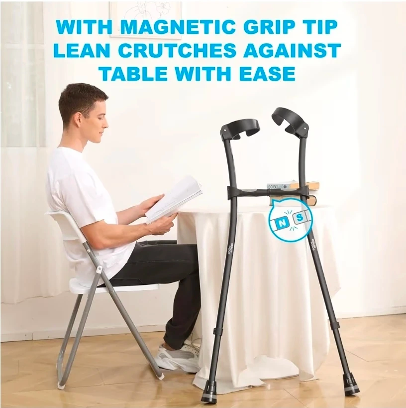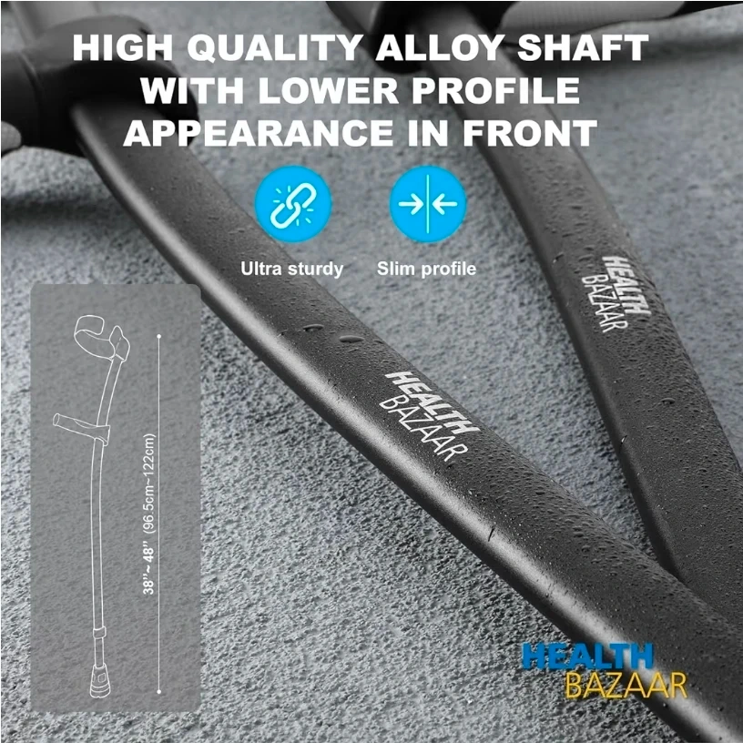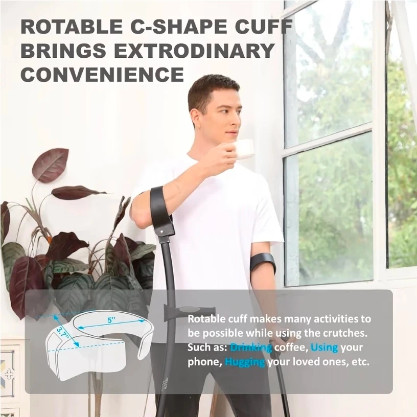 These Health Bazaar crutches are designed for comfort and convenience! The rotatable C-shape cuff makes many activities possible while using the crutches, such as drinking coffee, using your phone, and even hugging your loved ones. The grips can be adjusted up and down to suit different forearm lengths. They also feature a magnetic grip tip and a high-quality alloy shaft