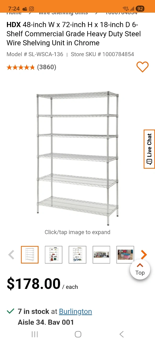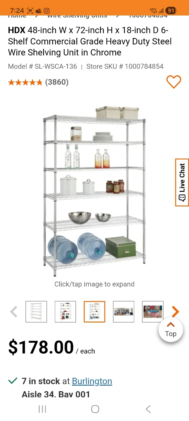 Selling an HDX 48-inch wide, 72-inch high, and 18-inch deep 6-shelf commercial grade heavy duty steel wire shelving unit in chrome. Model # SL-WSCA-136. Originally bought for $178