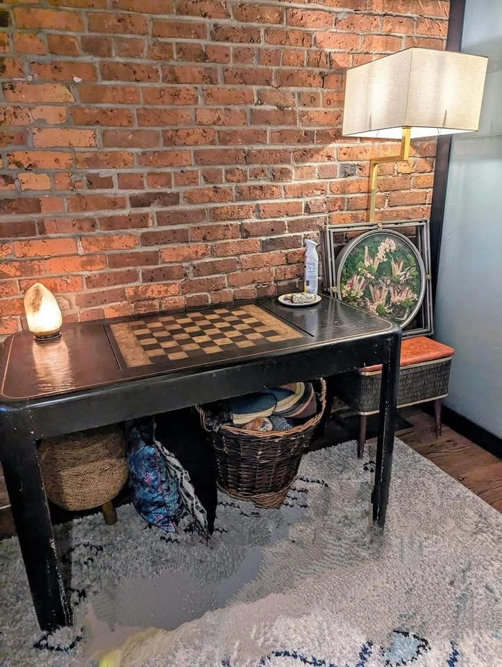 A stunning vintage piece with a dark wood finish and exceptional stability. This versatile table features a hidden drawer for game pieces (game pieces not included) and can double as an office desk.