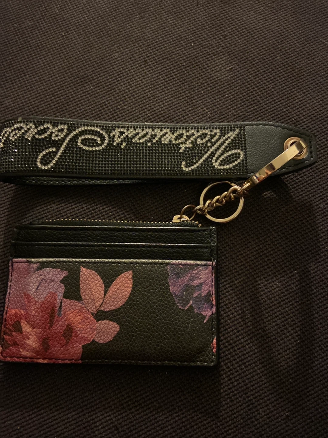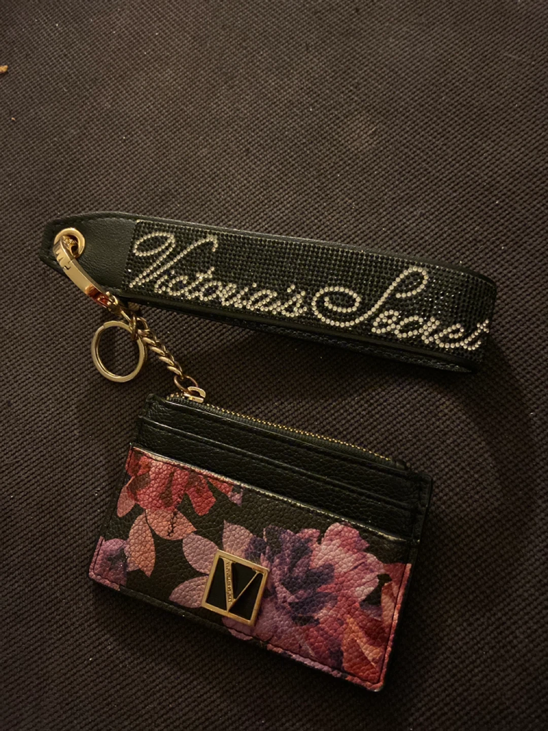 Selling a cute Victoria's Secret card holder with a floral design and a matching keychain. The card holder has a zippered compartment for change and slots for your cards. The keychain has the Victoria's Secret logo in rhinestones. Perfect for adding a touch of sparkle to your everyday essentials