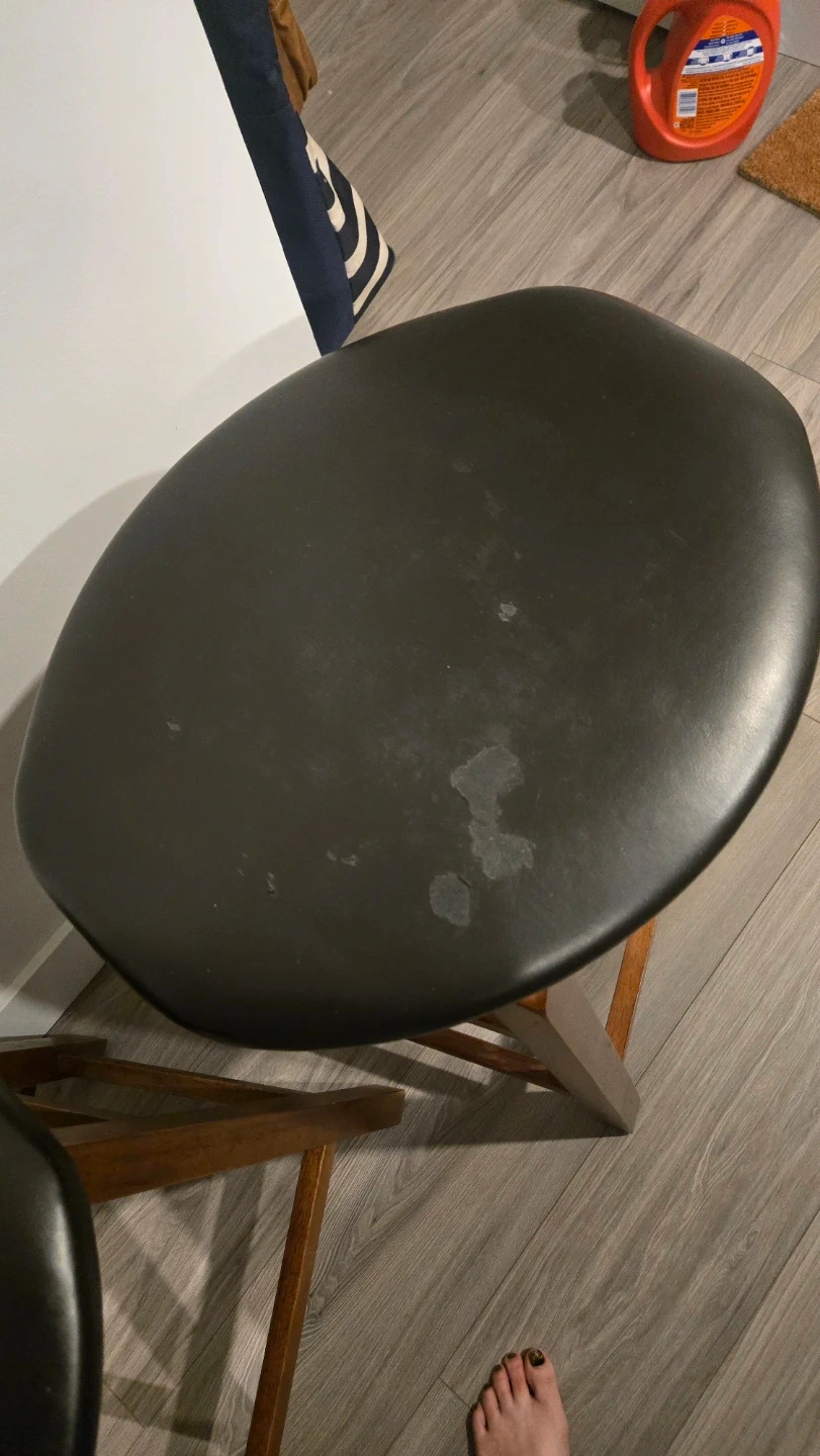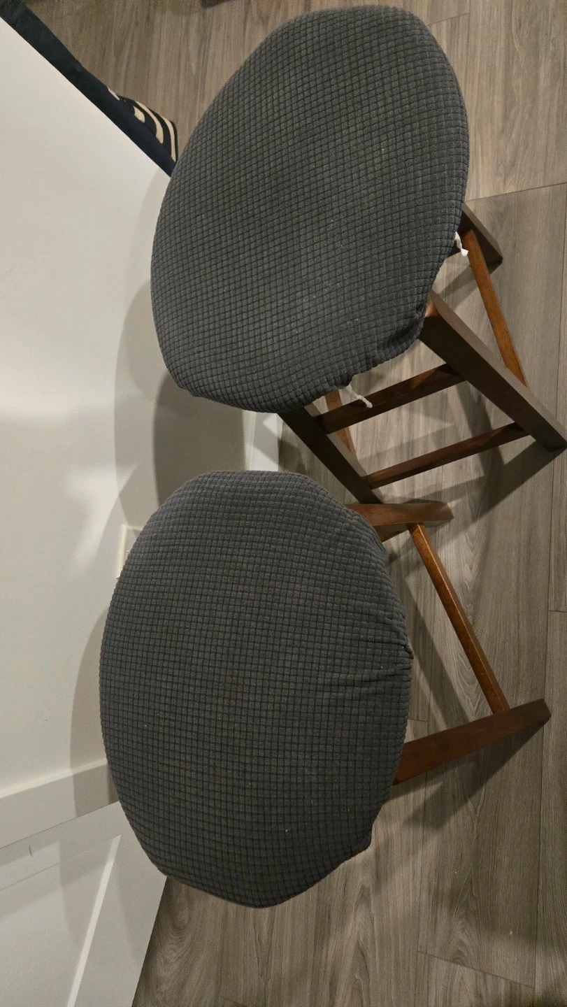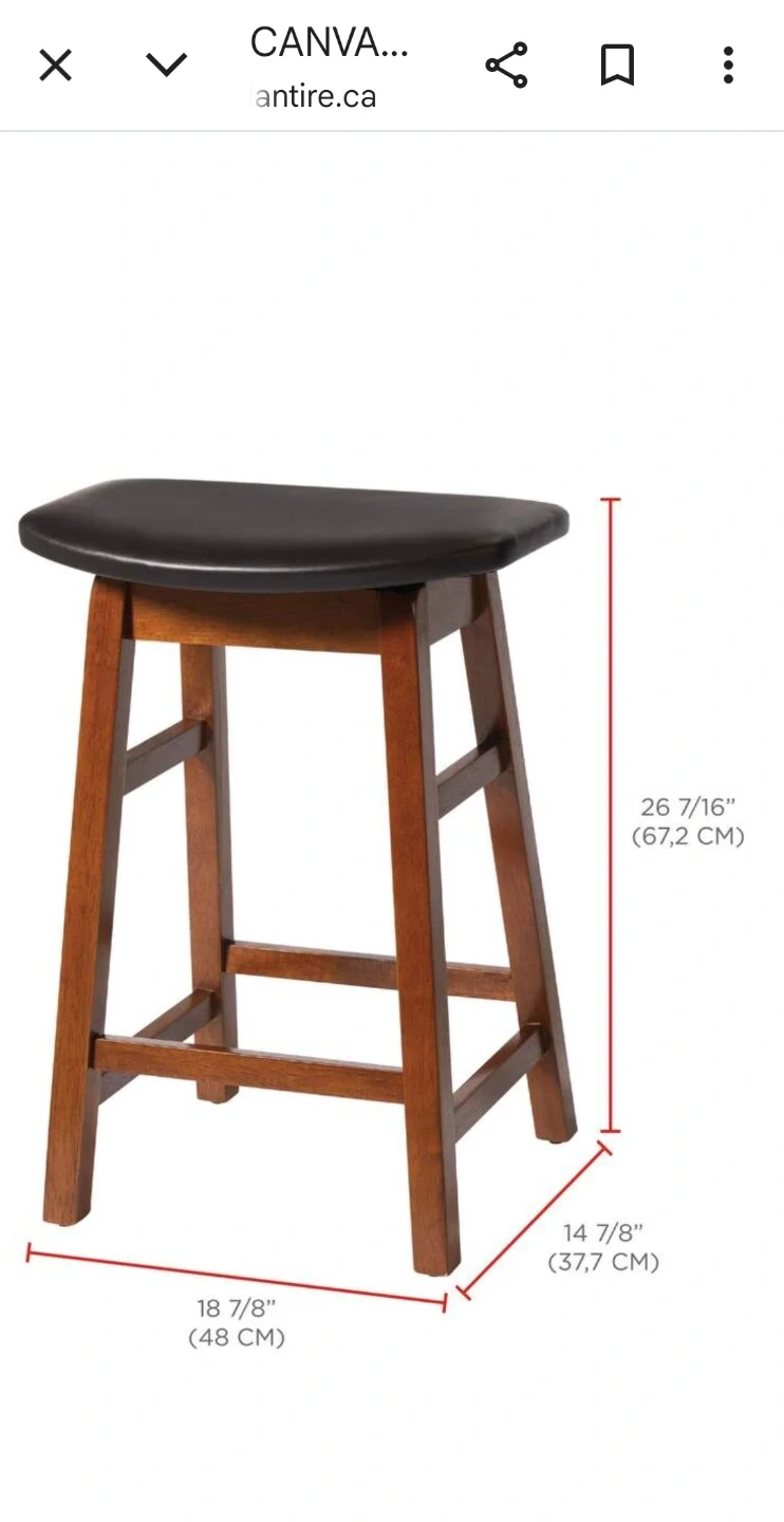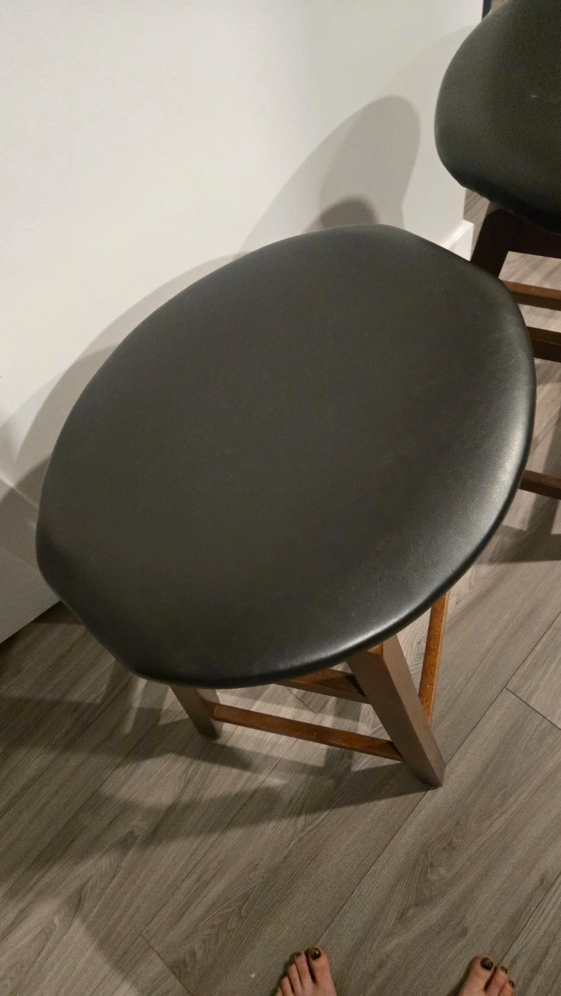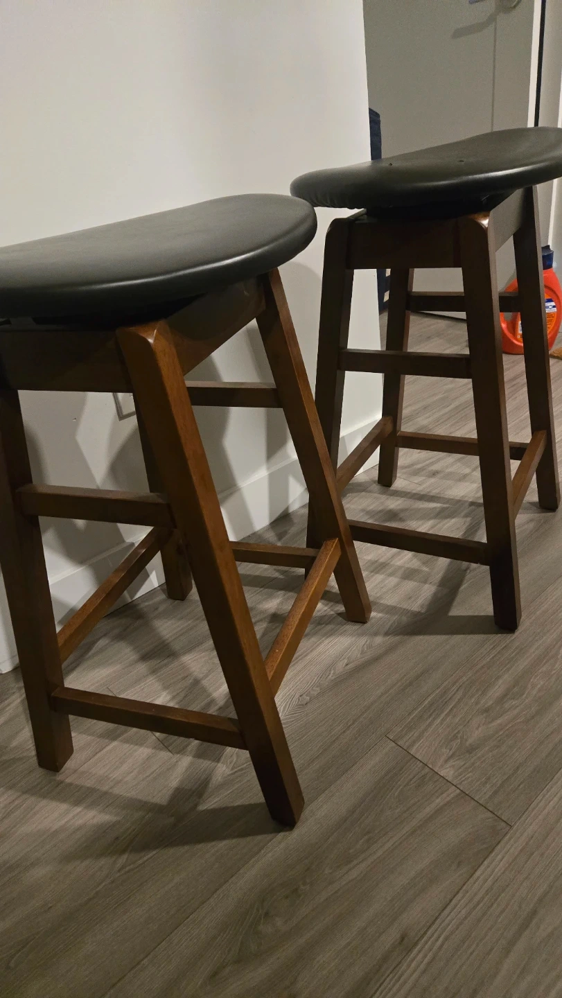 Selling a set of two counter height stools. The seat is black and the legs are wooden. Dimensions are approximately 26.75 inches (67.2 cm) high, 18.875 inches (48 cm) wide, and 14.875 inches (37.7 cm) deep. They're in good condition and ready for a new home!