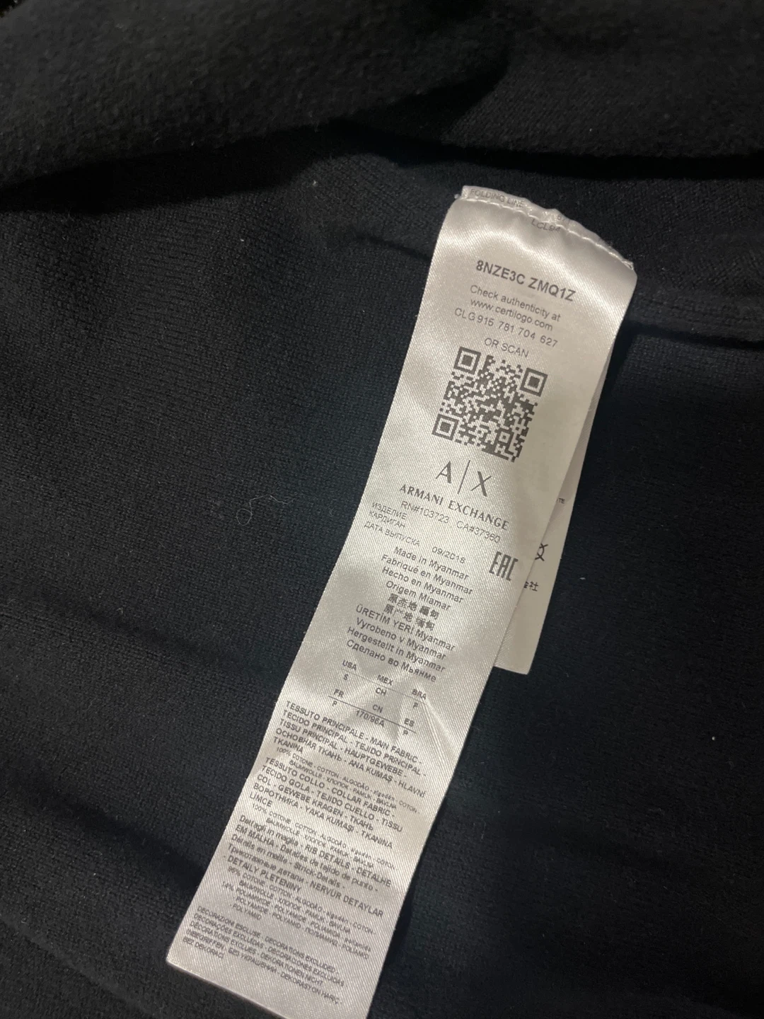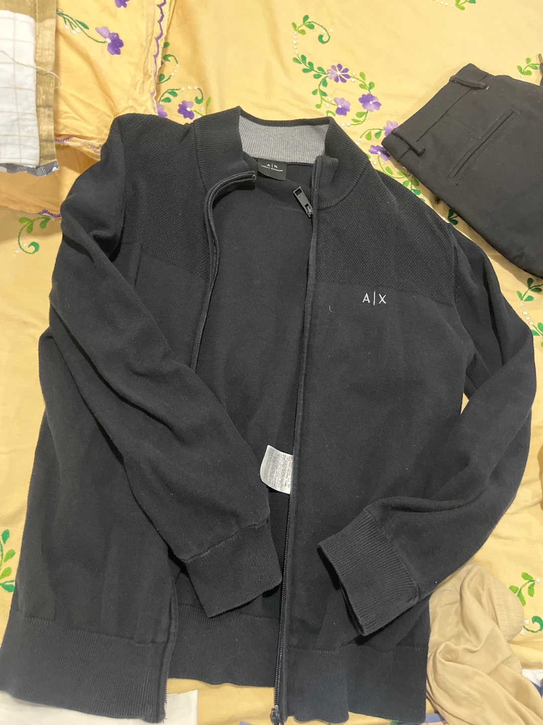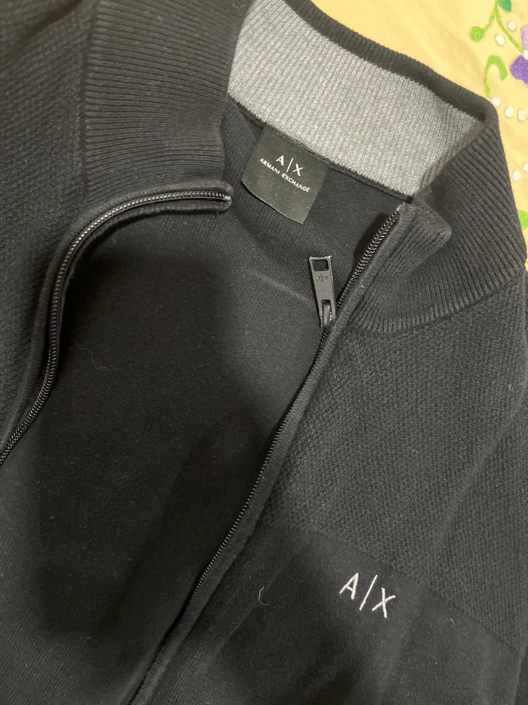 Here's a stylish black zip-up cardigan from Armani Exchange! It's in great condition and perfect for layering. The material feels nice and the design is classic and versatile for any wardrobe.