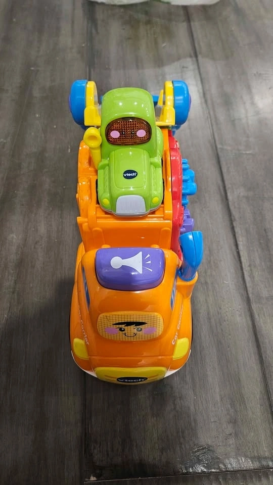 The track at the top of this electronic semi-truck converts to a ramp that lets the included non-electric vehicles zigzag to the bottom. With spinning gears and a light-up windshield, this toy car carrier helps little truckers build fine motor skills.