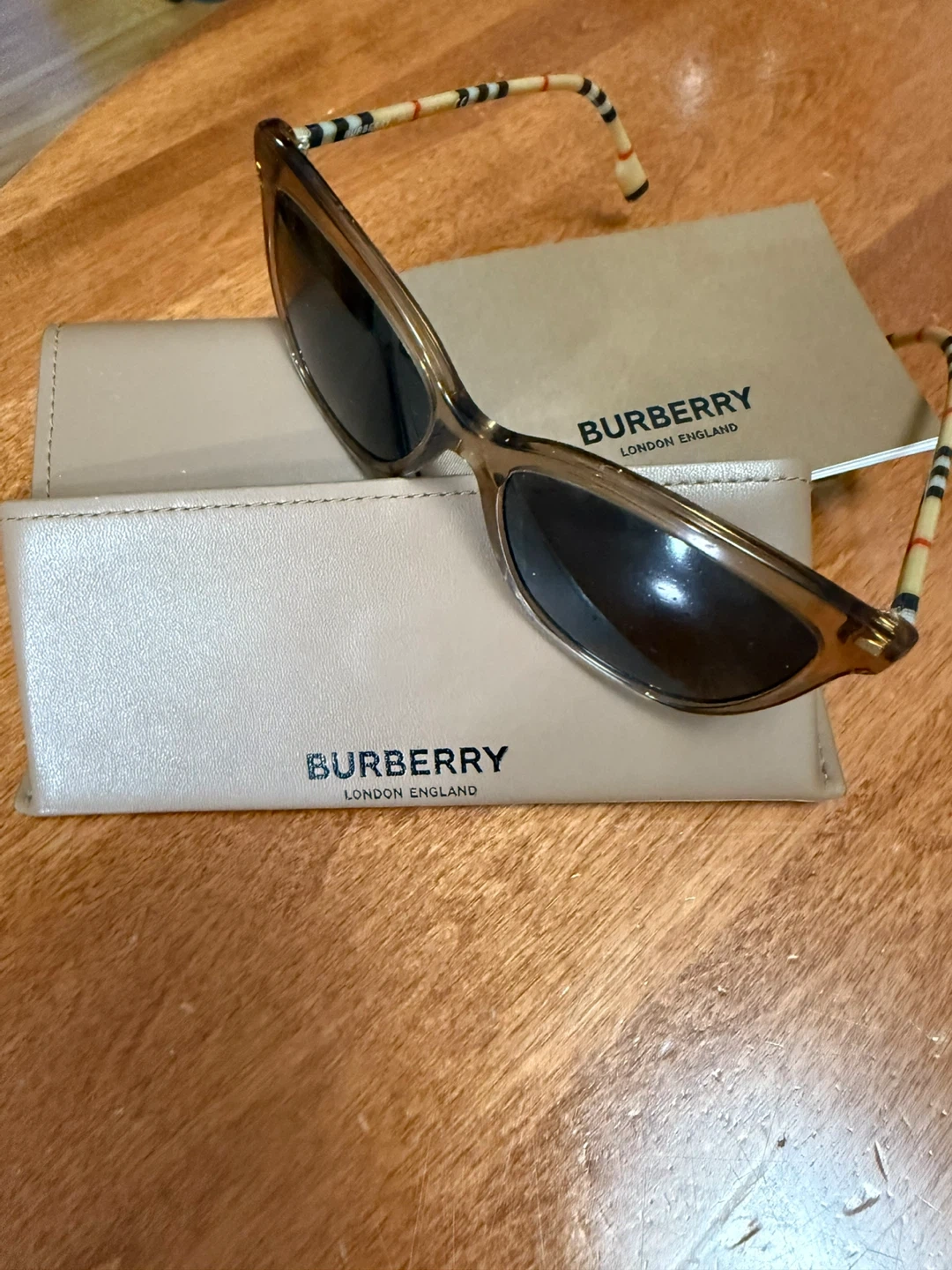 Selling a pair of Burberry sunglasses! They come with their original case. The frames are a light brown colour, and the arms have a unique striped design. Stylish and in great condition!