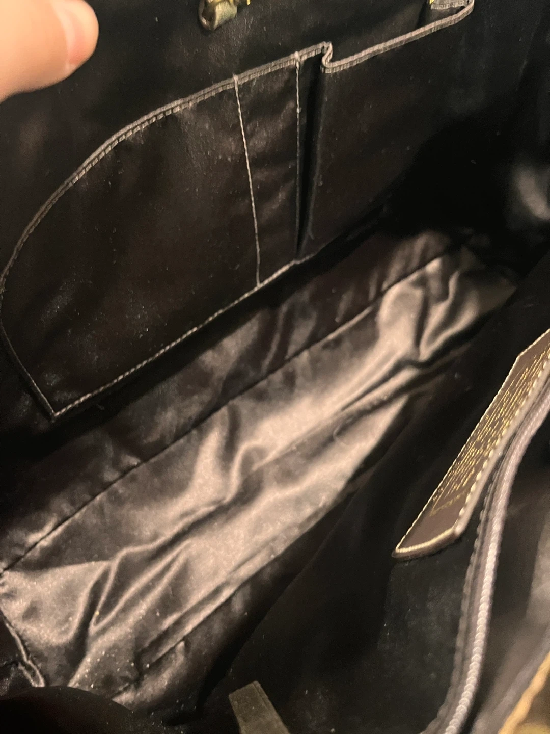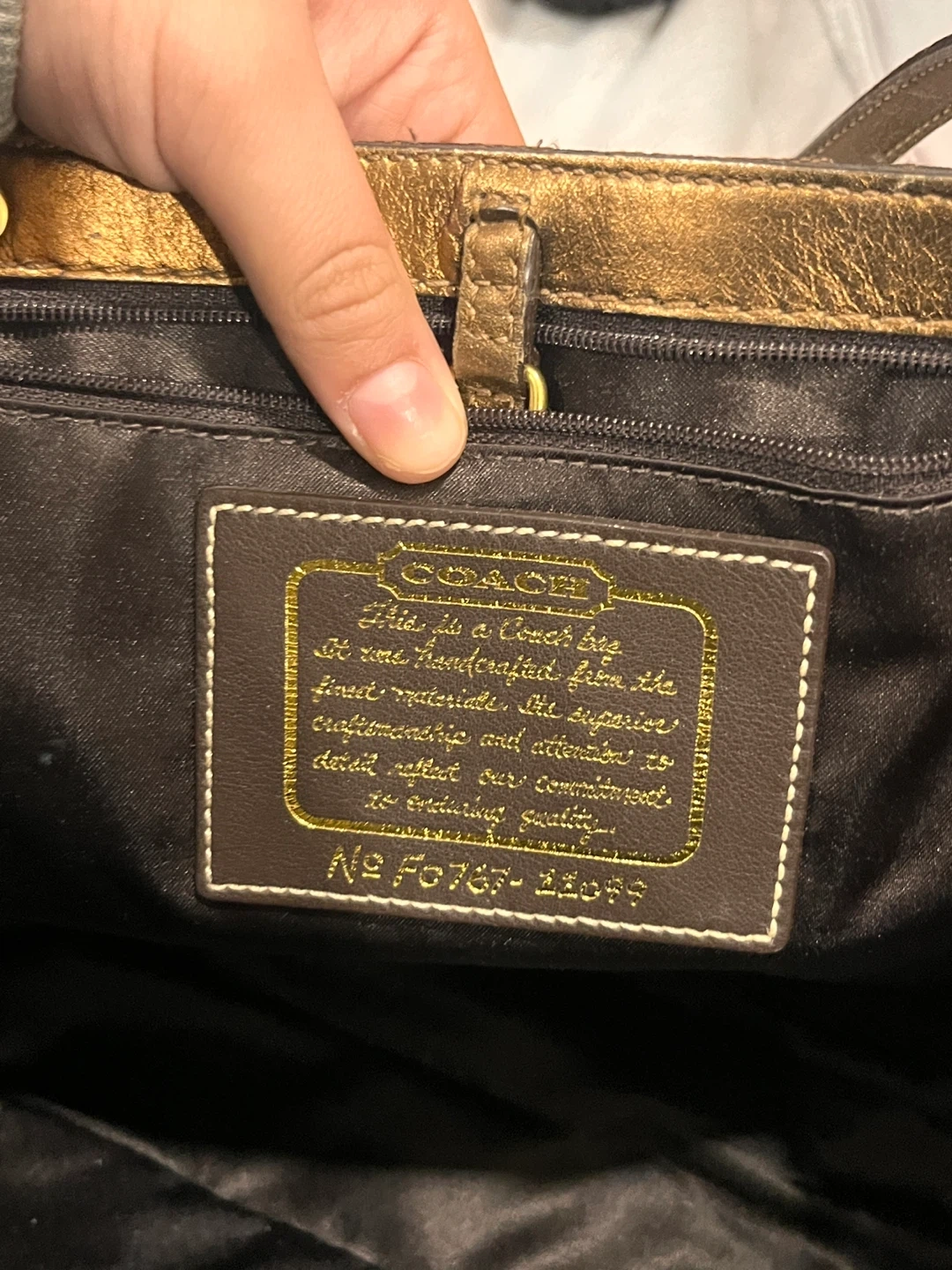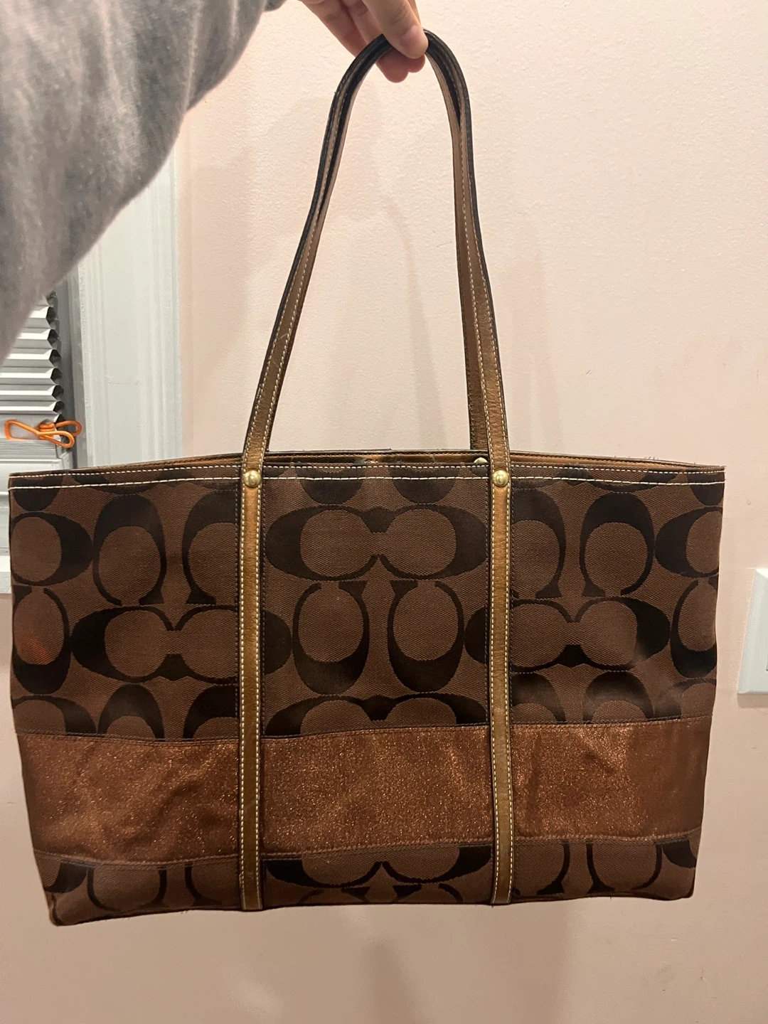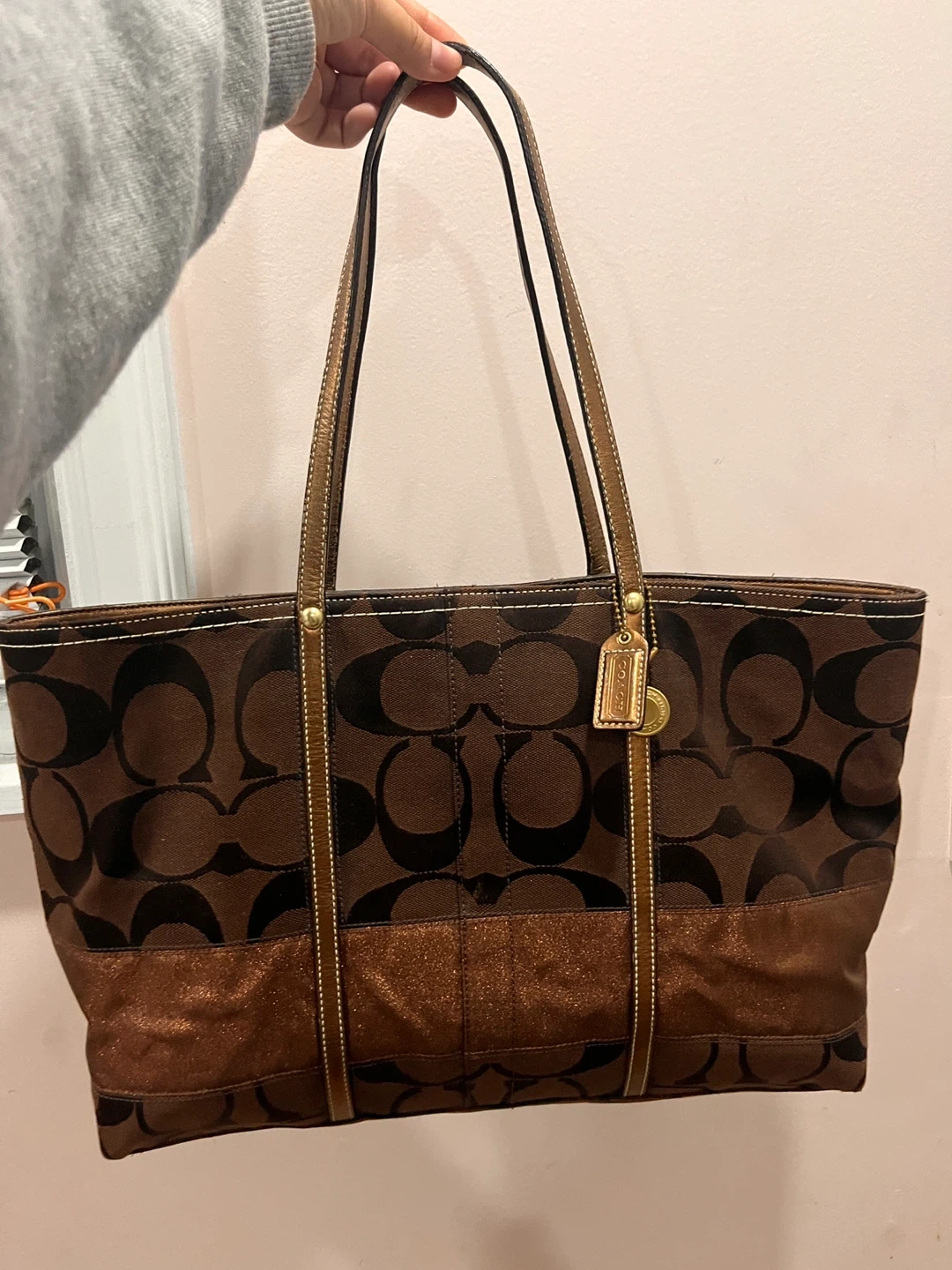 This is a Coach tote bag with a brown signature print. It's in good condition and ready for a new owner! The bag features a classic design with the iconic Coach logo pattern.