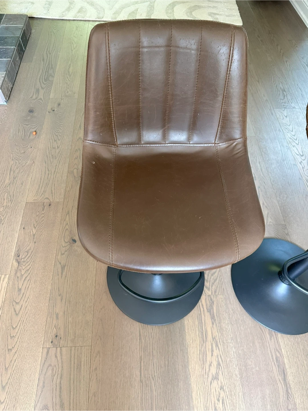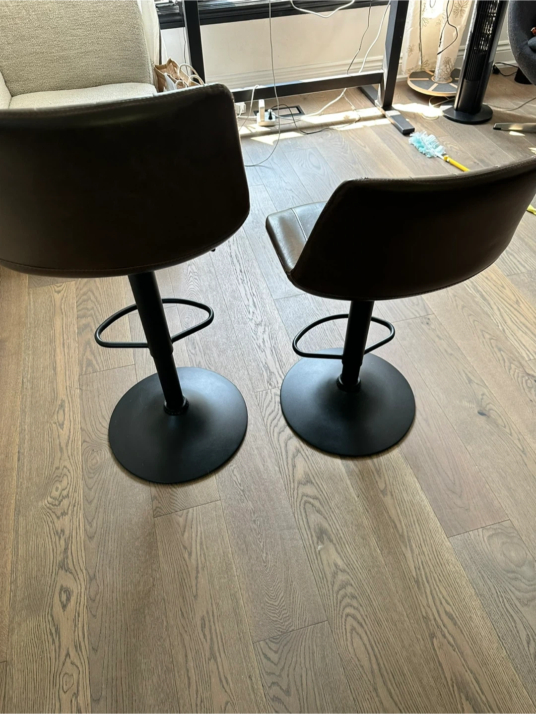Selling a set of two swivel bar stools! They're a nice brown colour leather with Matt black base and would look great in a kitchen or bar area. They're in good condition and ready for a new home!