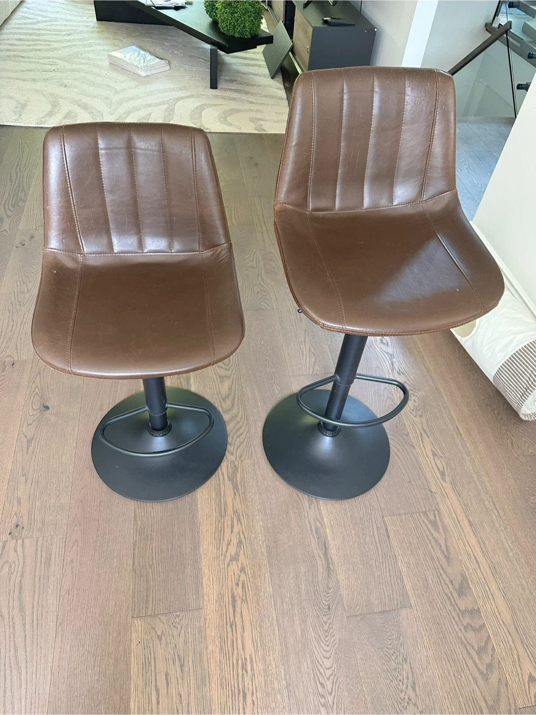 Selling a set of two swivel bar stools! They're a nice brown colour leather with Matt black base and would look great in a kitchen or bar area. They're in good condition and ready for a new home!