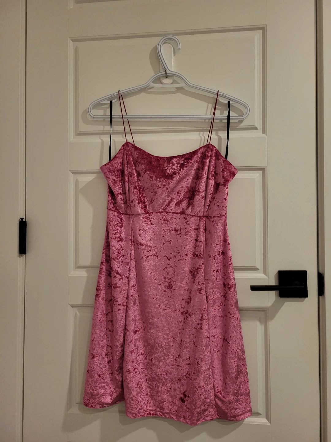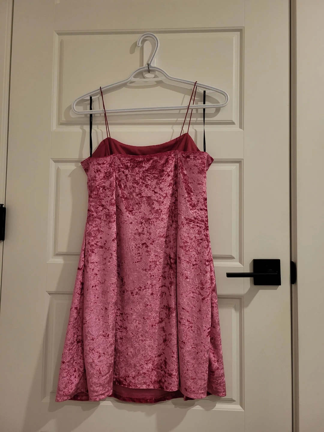 Selling a cute pink velvet mini dress! It's in great condition (only worn twice) and perfect for a night out or a special occasion. The dress has spaghetti straps and a flattering fit. It's a stylish addition to any wardrobe! Great summer piece as well!