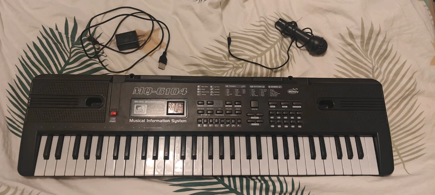 Selling an MQ-6104 electronic keyboard. It comes with a microphone and power adapter. Great for beginners or anyone looking to have some musical fun! Rarely used as upgraded to a bigger one.