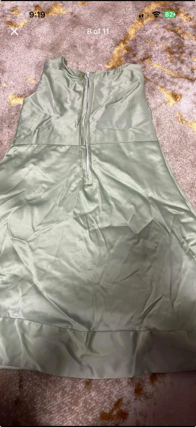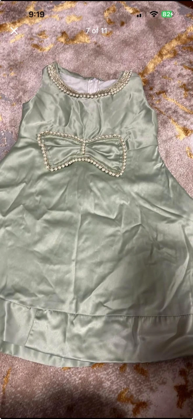 A cute green dress with a bow detail on the front. It has a zipper in the back. Perfect for a special occasion! Girls silk dress for age 2 to 4 years