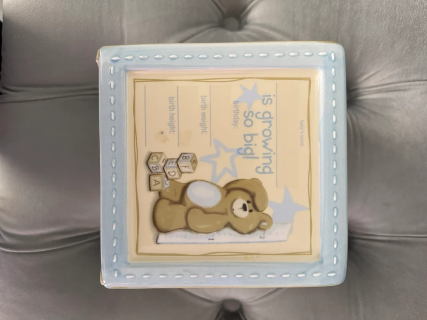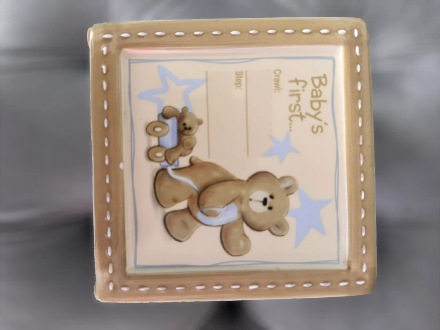 Here's a cute ceramic box for baby's first moments! It features adorable teddy bear designs and spaces to record important milestones like first smile, word, birthday, and more. Perfect for storing precious keepsakes!