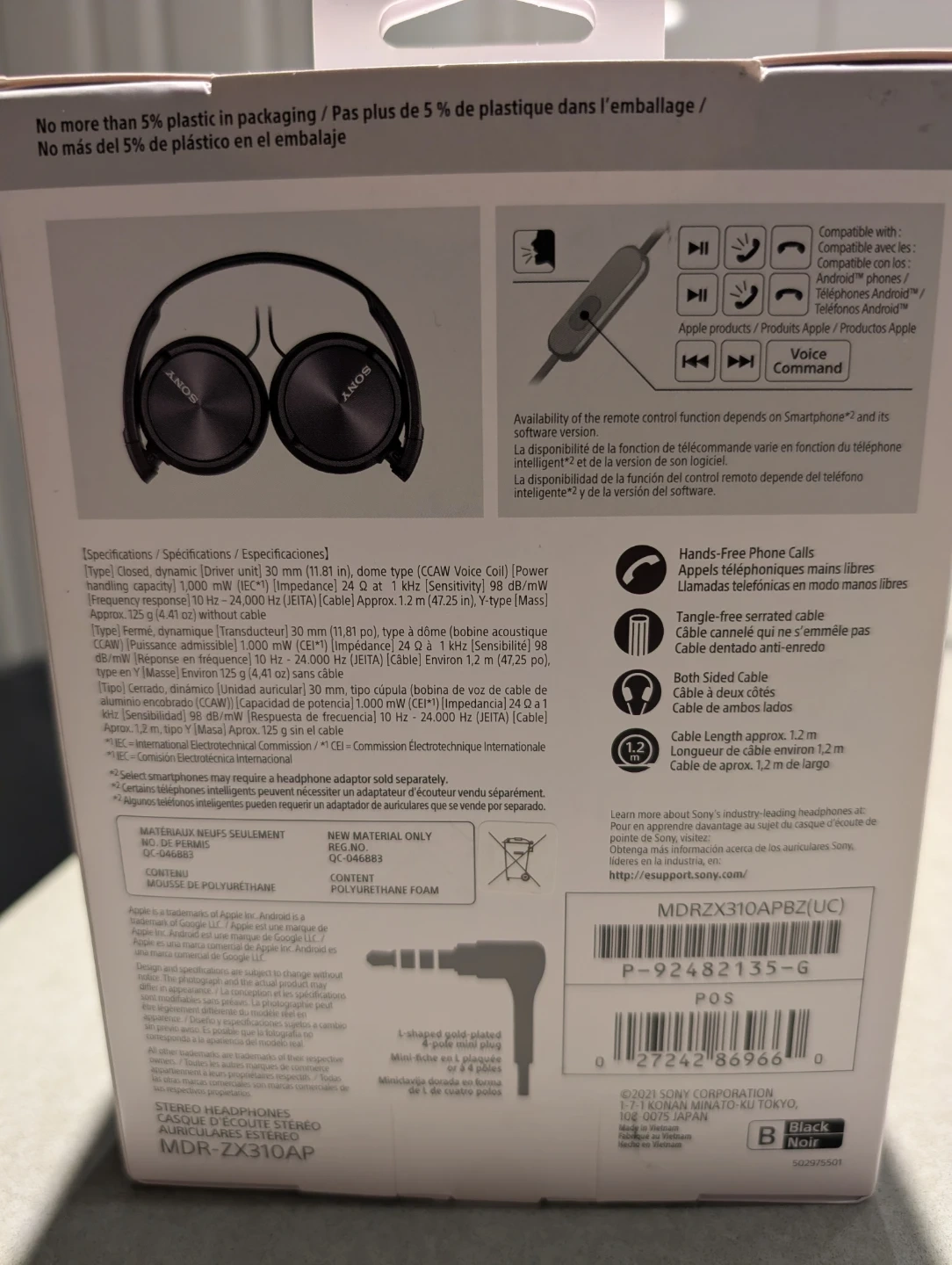 Selling a pair of Sony MDR-ZX310AP headphones in black! They are in great condition and come with the original box. These headphones feature a tangle-free cord and hands-free phone call capabilities. The cable is approximately 1.2m long, perfect for everyday use
