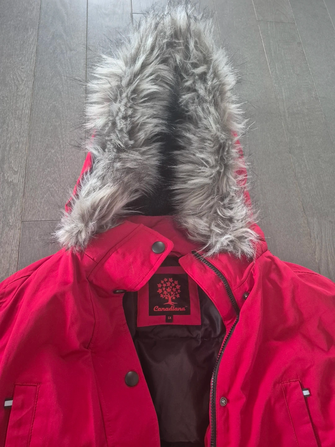 Selling a Canadiana winter parka in a vibrant red colour. It's a size 1X and features a faux fur-trimmed hood to keep you warm during those cold Canadian winters. This jacket is perfect for staying cozy and stylish!