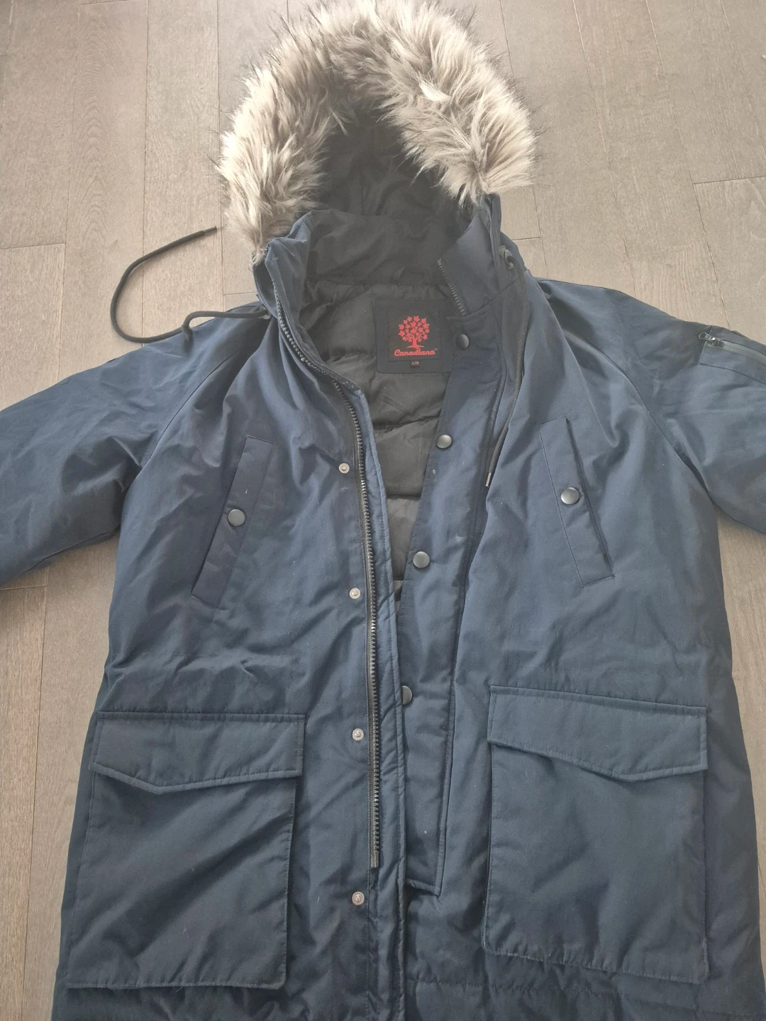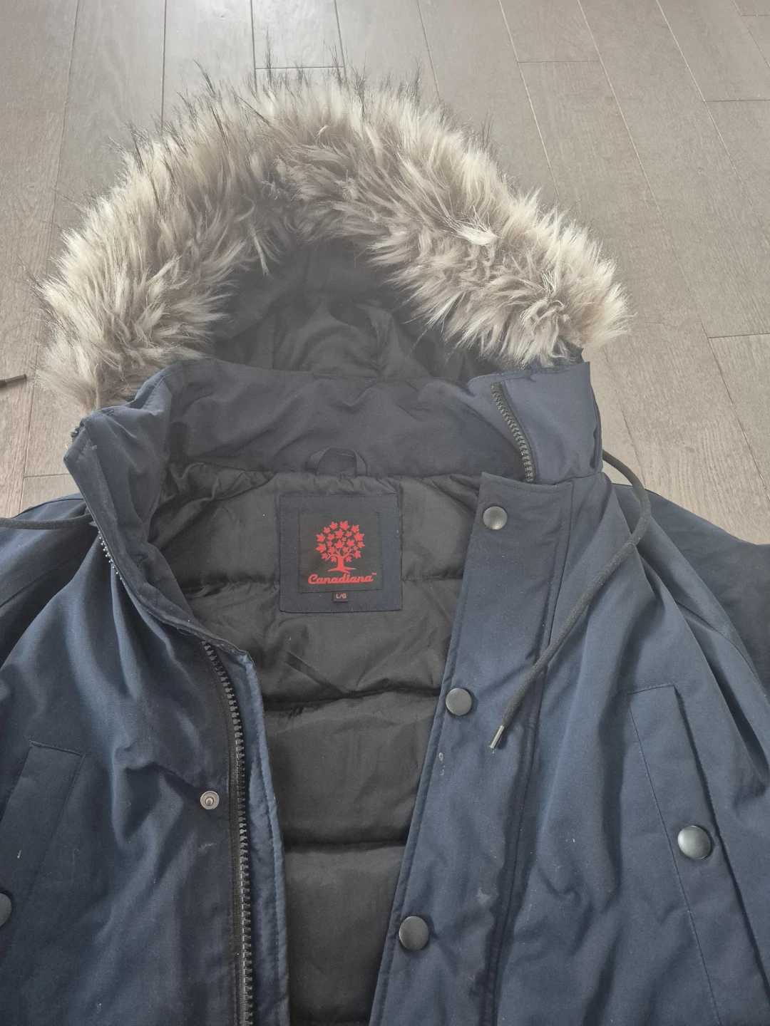 Selling a Canadiana winter parka in navy blue, size large. It's in great shape and ready to keep you warm this winter! The parka features a faux fur-trimmed hood and plenty of pockets for all your essentials