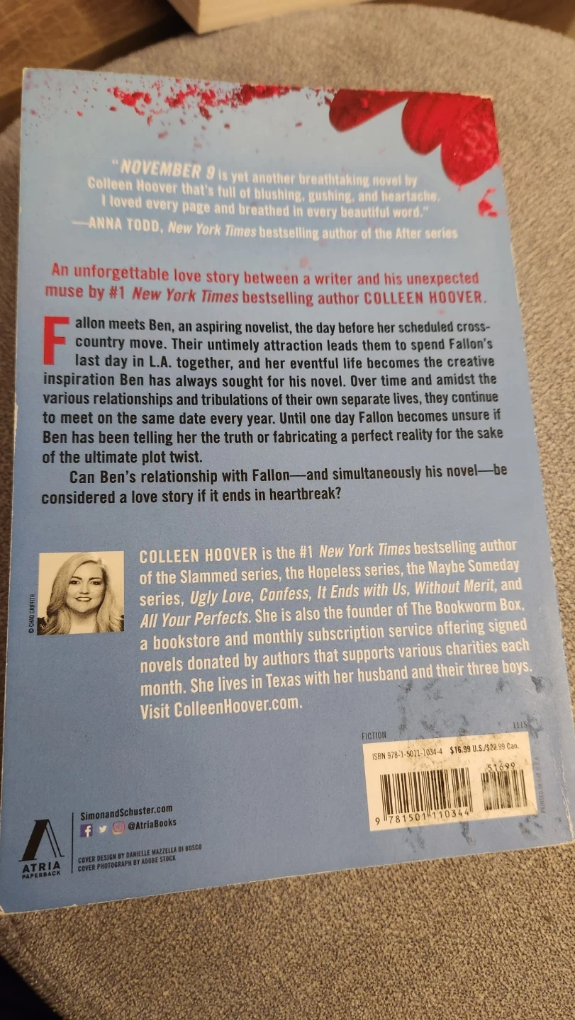 Selling a copy of November 9 by Colleen Hoover! This is a novel about an unforgettable love story between a writer and his unexpected muse. Perfect for anyone who enjoys a good romance novel!