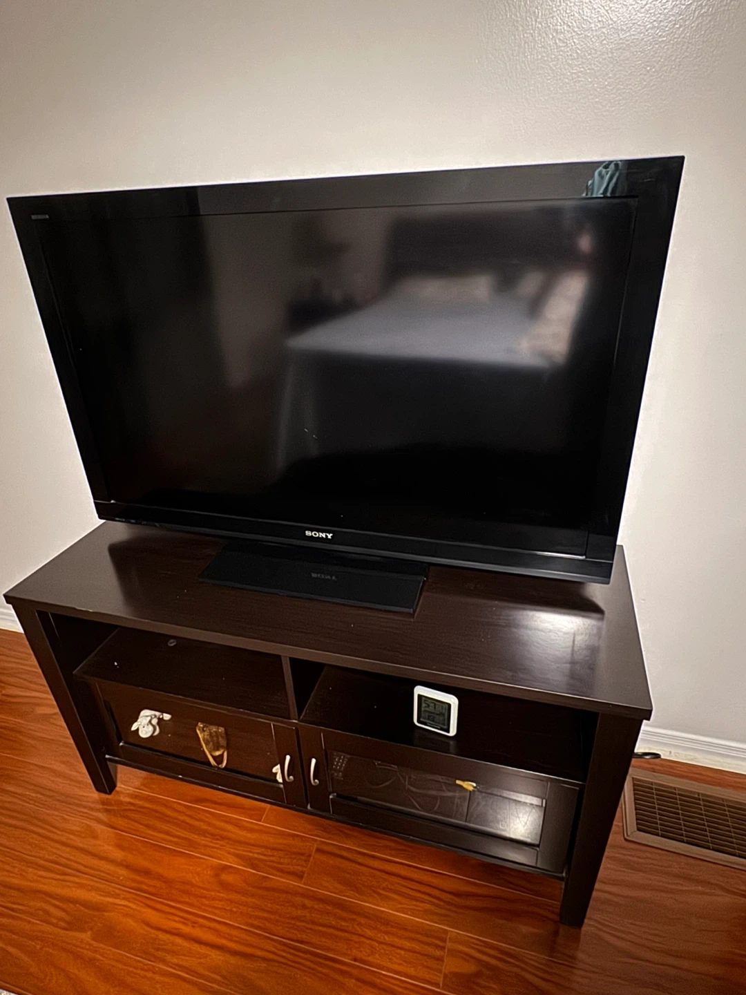 Selling a Sony TV ( not a smart tv) with a dark brown TV stand in excellent condition. It's a great set for any living room or entertainment area. The TV stand offers ample storage with its shelves and cabinets!