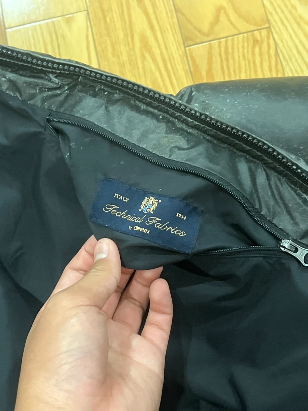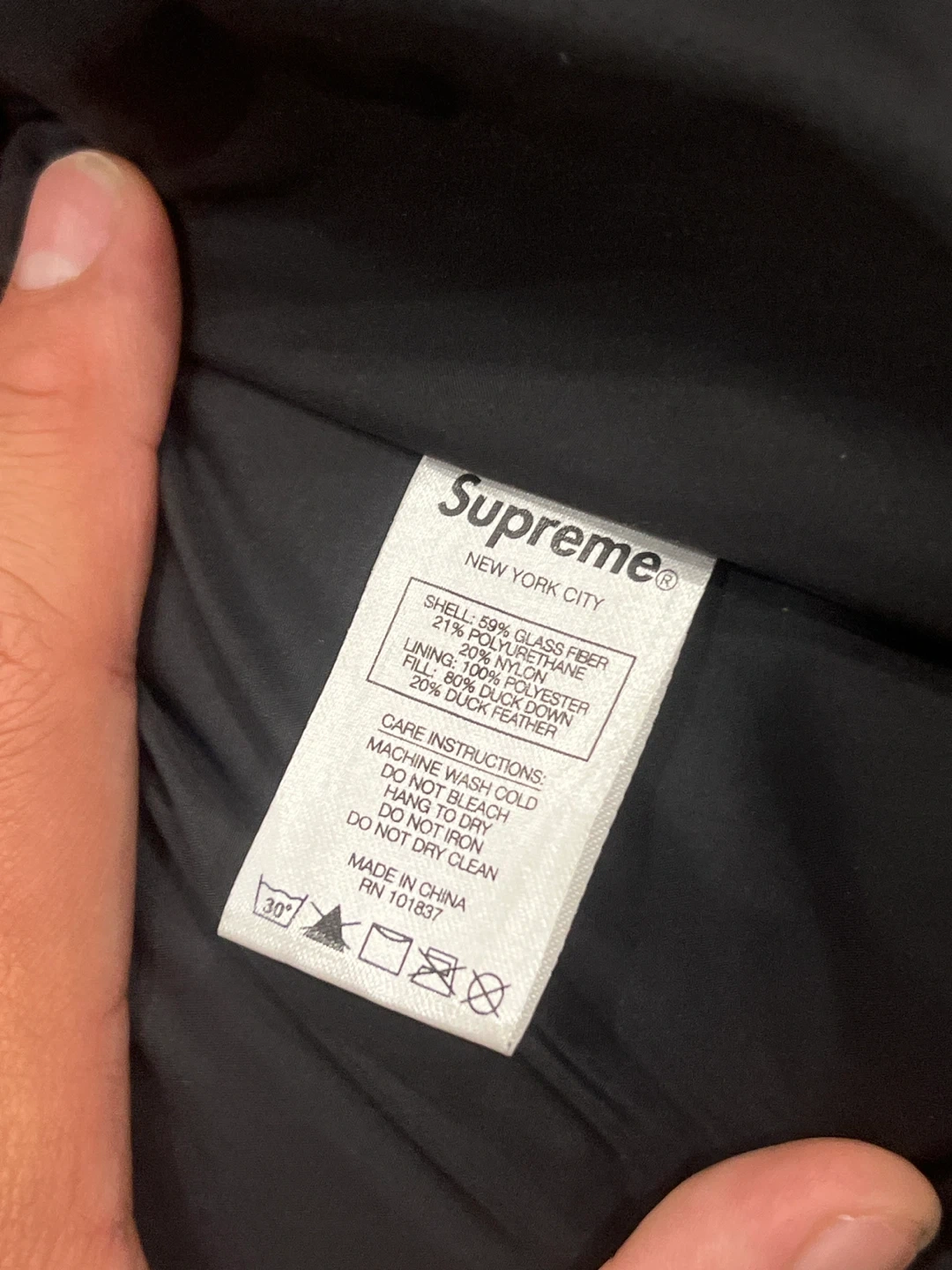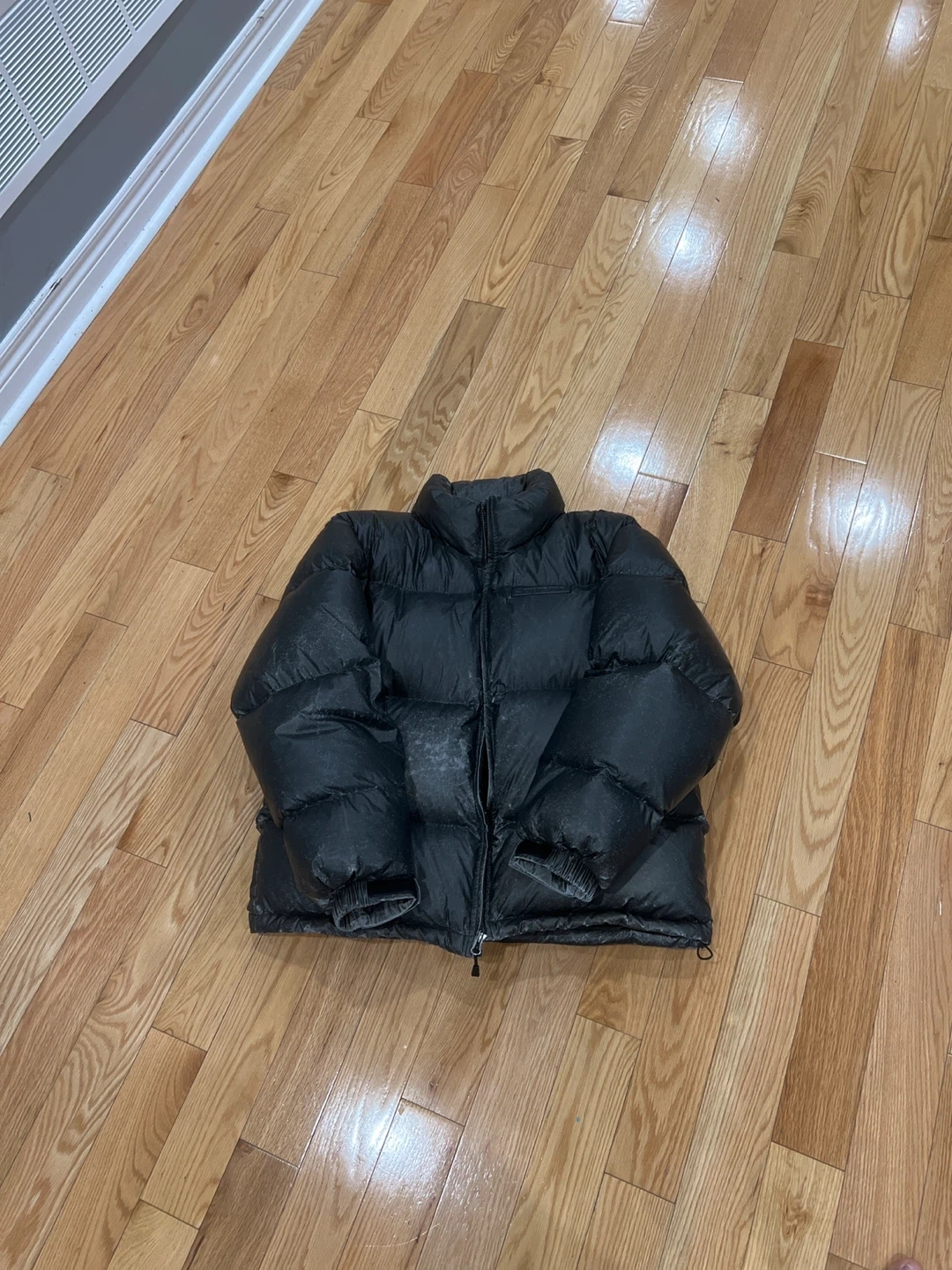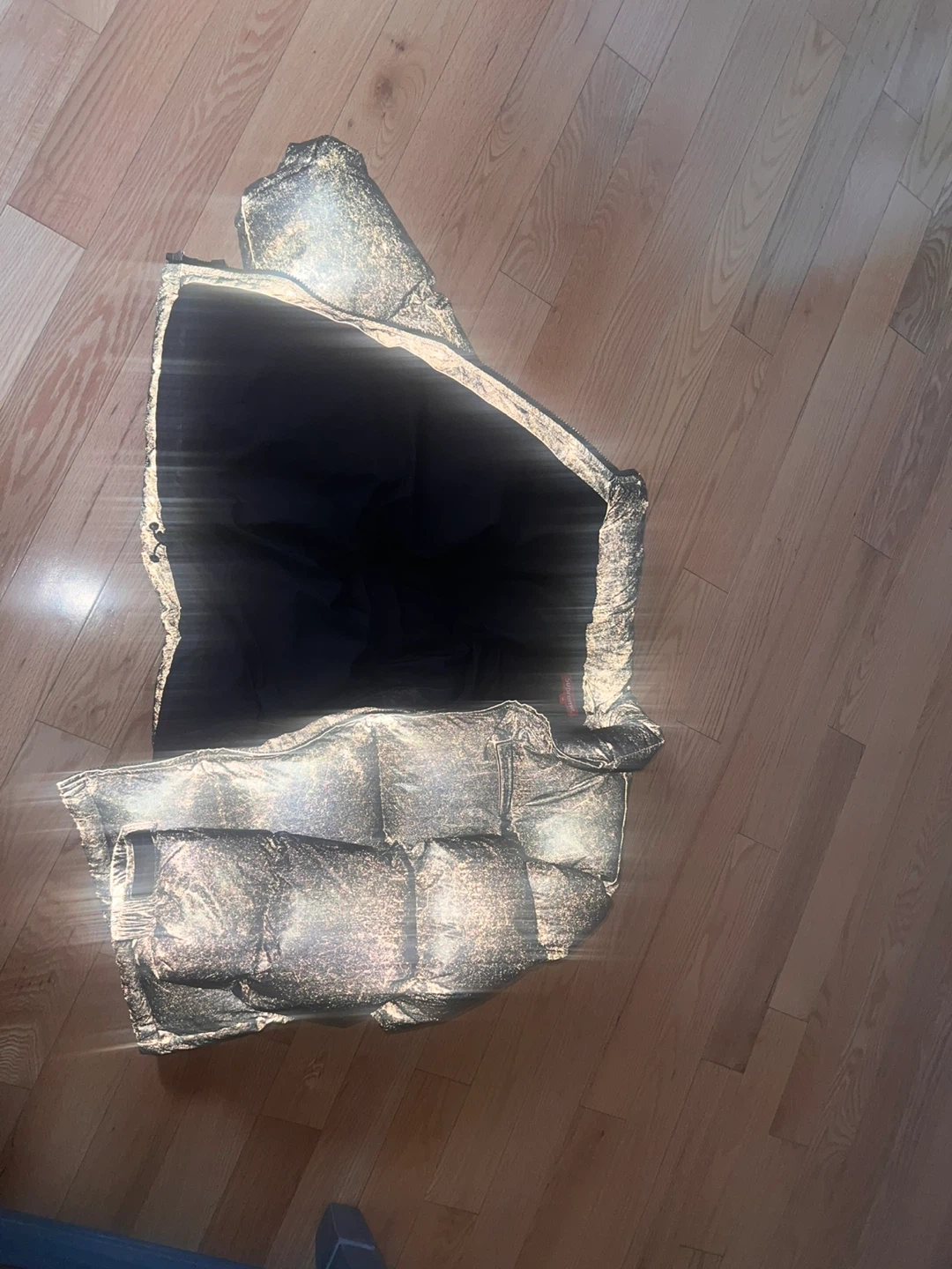 this is a supreme puffer jacket good for winter and style,it keeps you warm during cold weather.its not dirty nore damaged it just the reflection design.