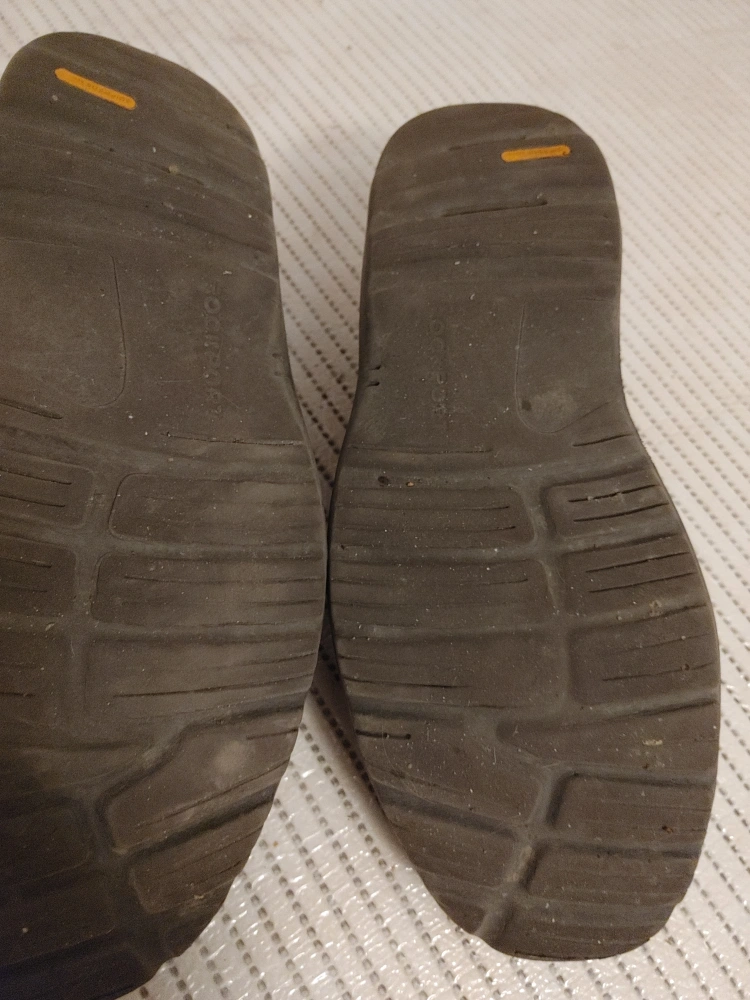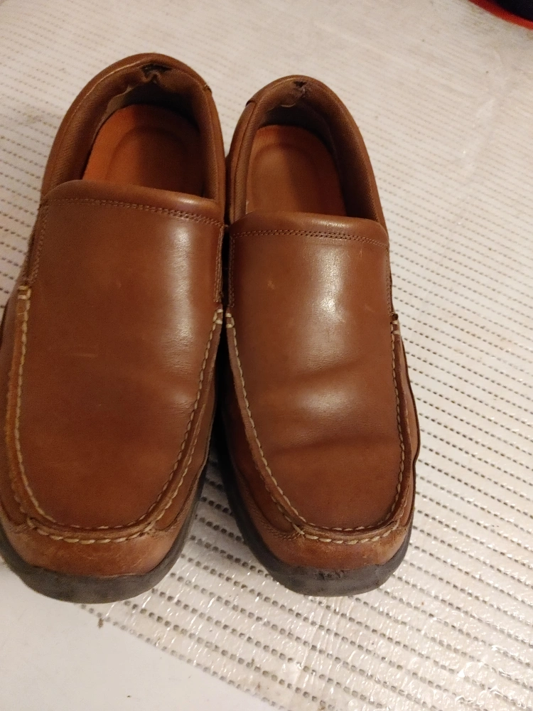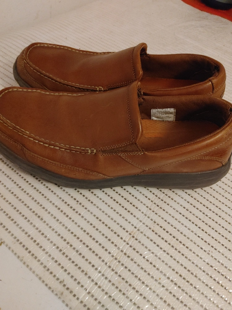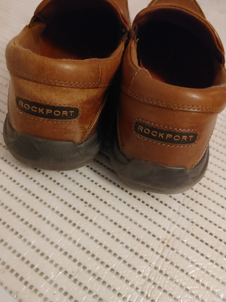 Selling a pair of Rockport men's leather slip-on loafers in brown. They show some signs of wear, but are still in good condition for everyday use. Great for a casual look and easy to slip on and off!