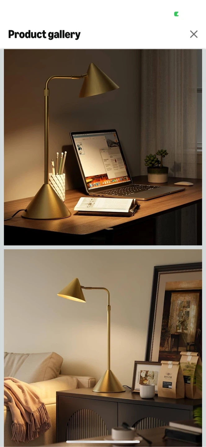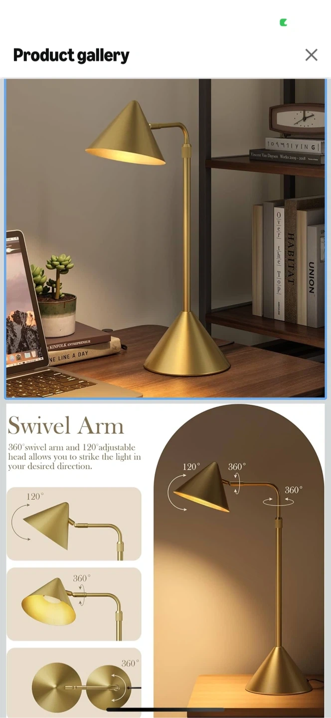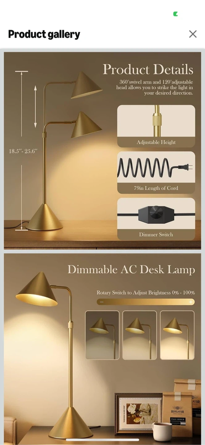 This is a gold dimmable AC desk lamp. It features a 360° swivel arm and a 120° adjustable head, allowing you to direct the light where you need it. The height is adjustable from 18.5" to 25.6". It also has a dimmer switch so you can adjust the brightness from 0% to 100%.