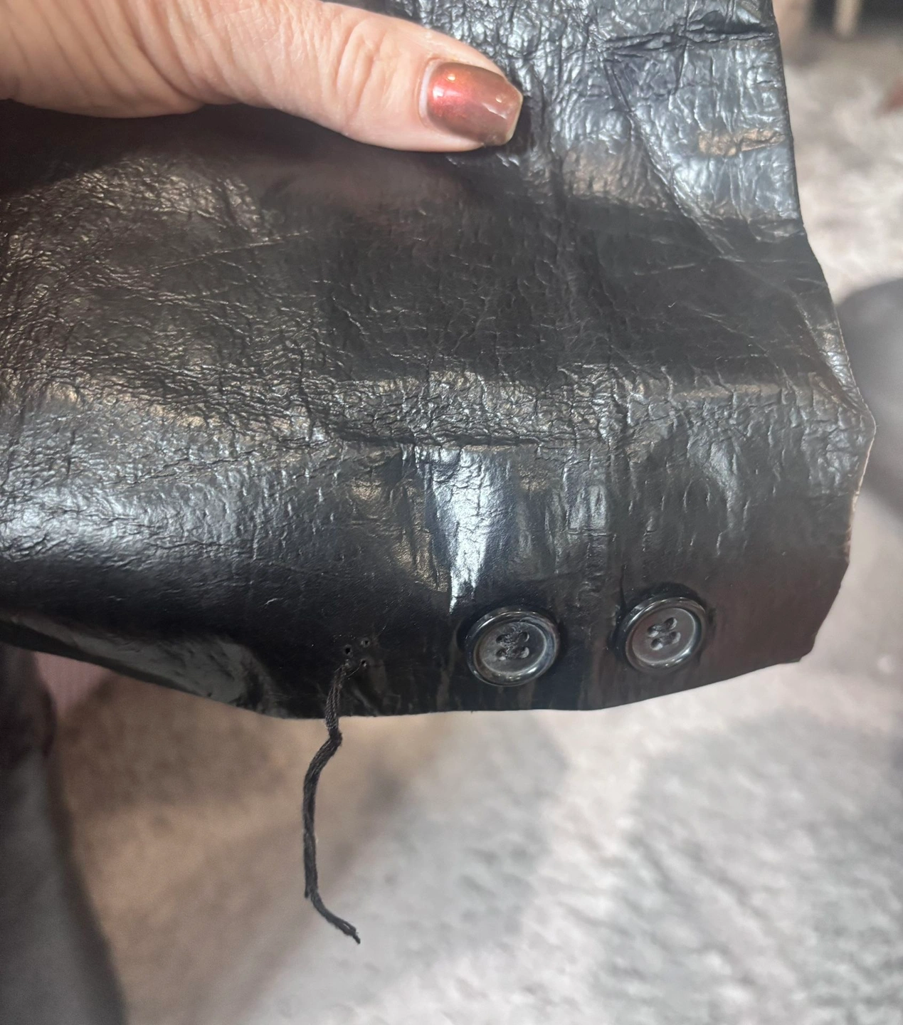 Two buttons are missing from each sleeve cuff (cosmetic only). And one of the buttons is a little loose. Does not affect wearability or structure. Otherwise excellent condition. Buttons can be replaced by a tailor if desired. Please review all photos carefully