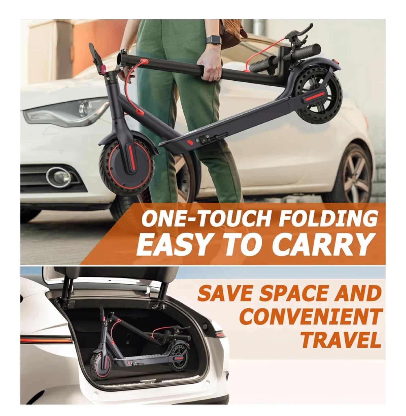 This electric scooter features an electric brake and a mechanical drum brake with a brake light. It also has a one-touch folding design, making it easy to carry and store.