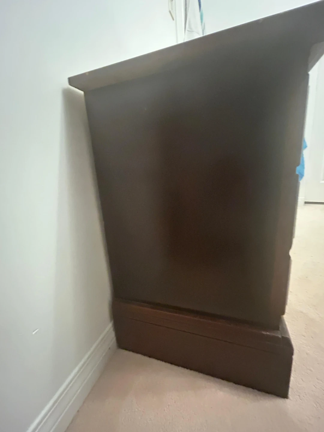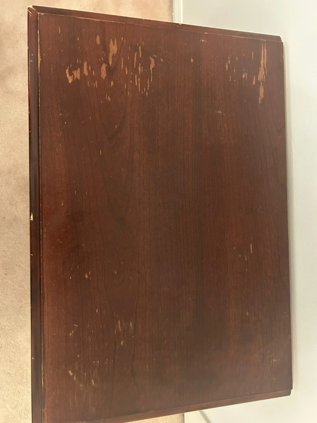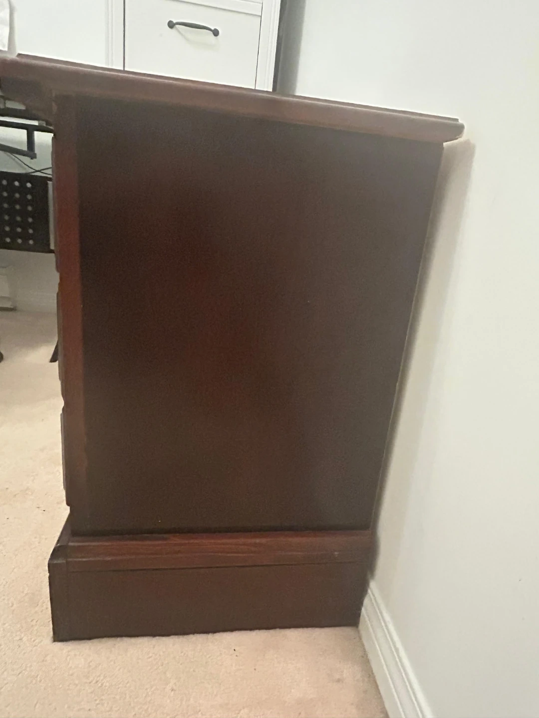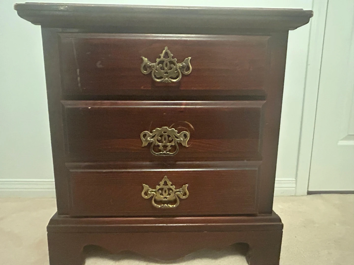 Here's a wooden nightstand with two drawers (the bottom one is the latlrge one). It has a dark brown finish and ornate gold-coloured handles. There are some signs of wear on the top surface and front, but it's still a functional piece of furniture.