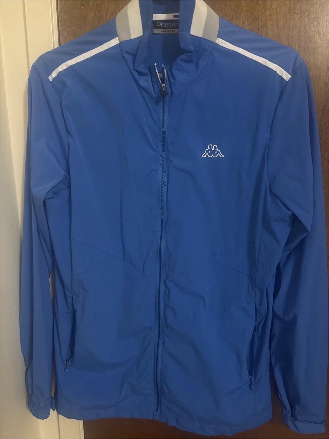 Selling a blue Kappa jacket in size large. It's in great !! condition and ready for a new owner! The jacket features the Kappa logo and a stylish design. Perfect for casual wear or light workouts