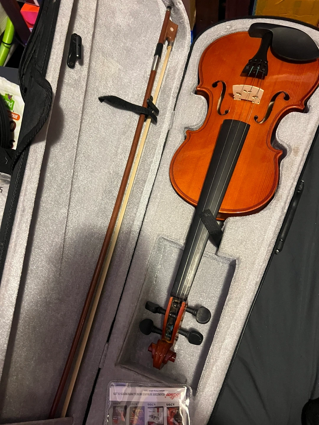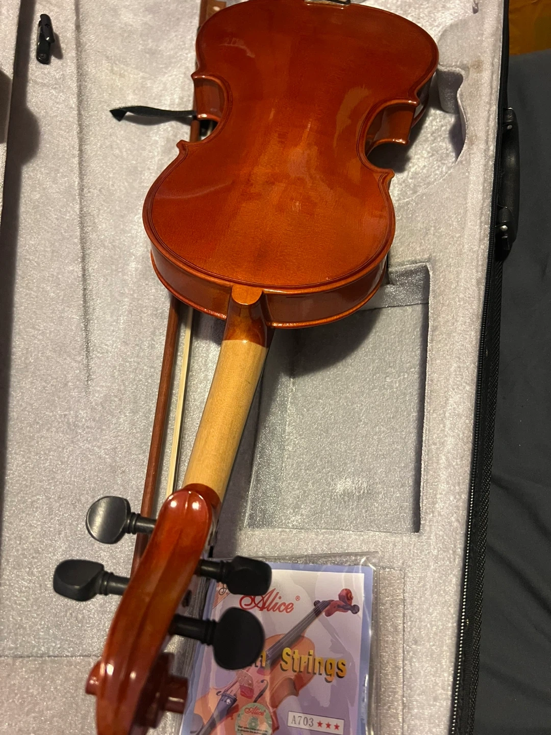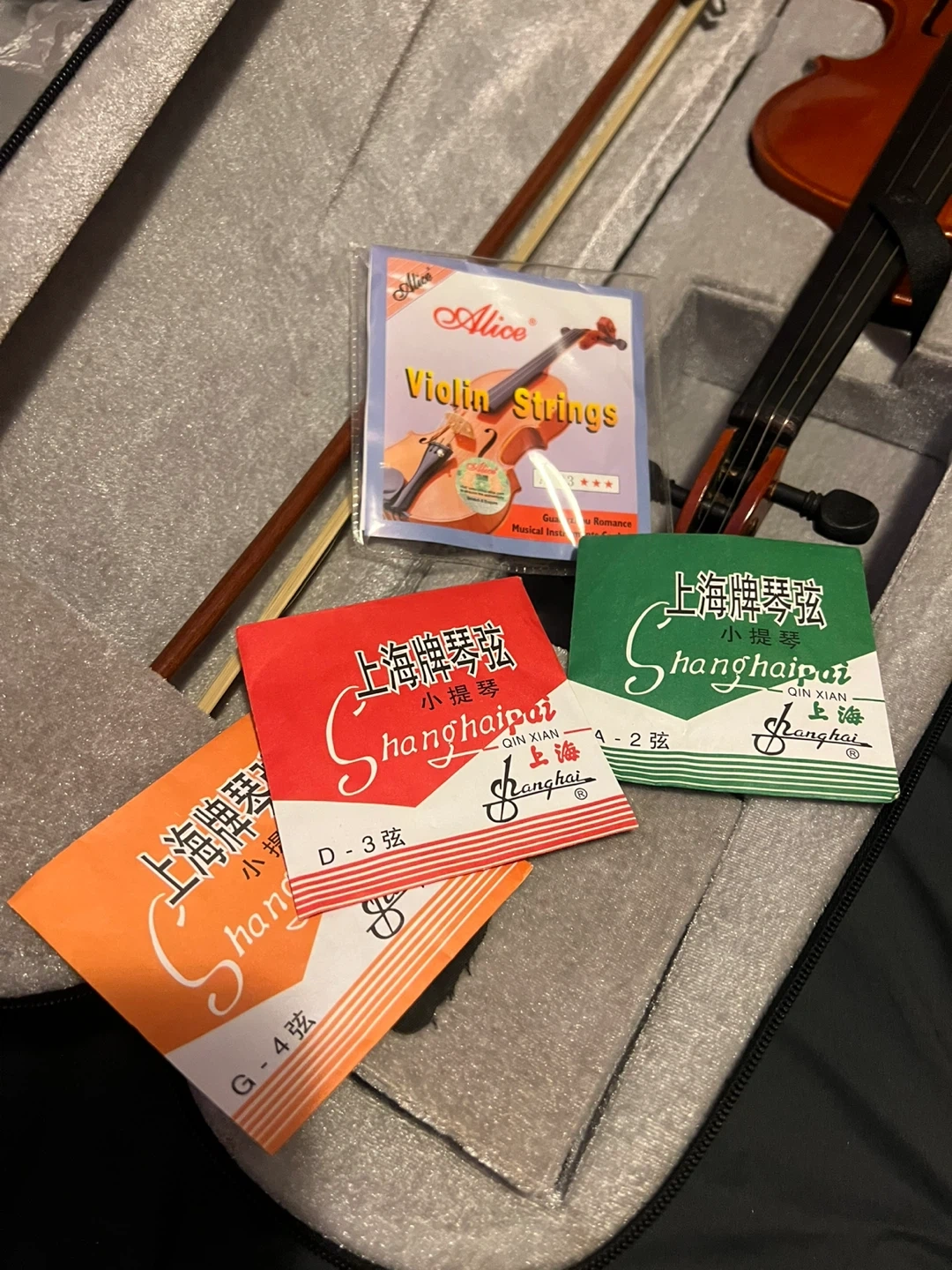 Selling a violin that comes with a bow, case, and a variety of strings. The strings include Alice Violin Strings and Shanghai strings in different gauges (G-4, D-3, A-2). The case is also included to keep everything safe and organized